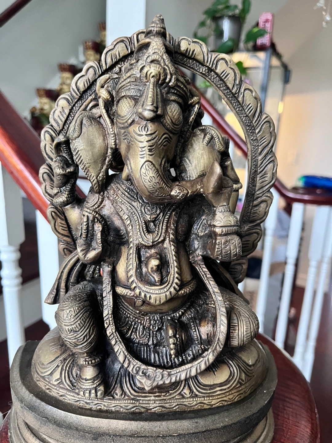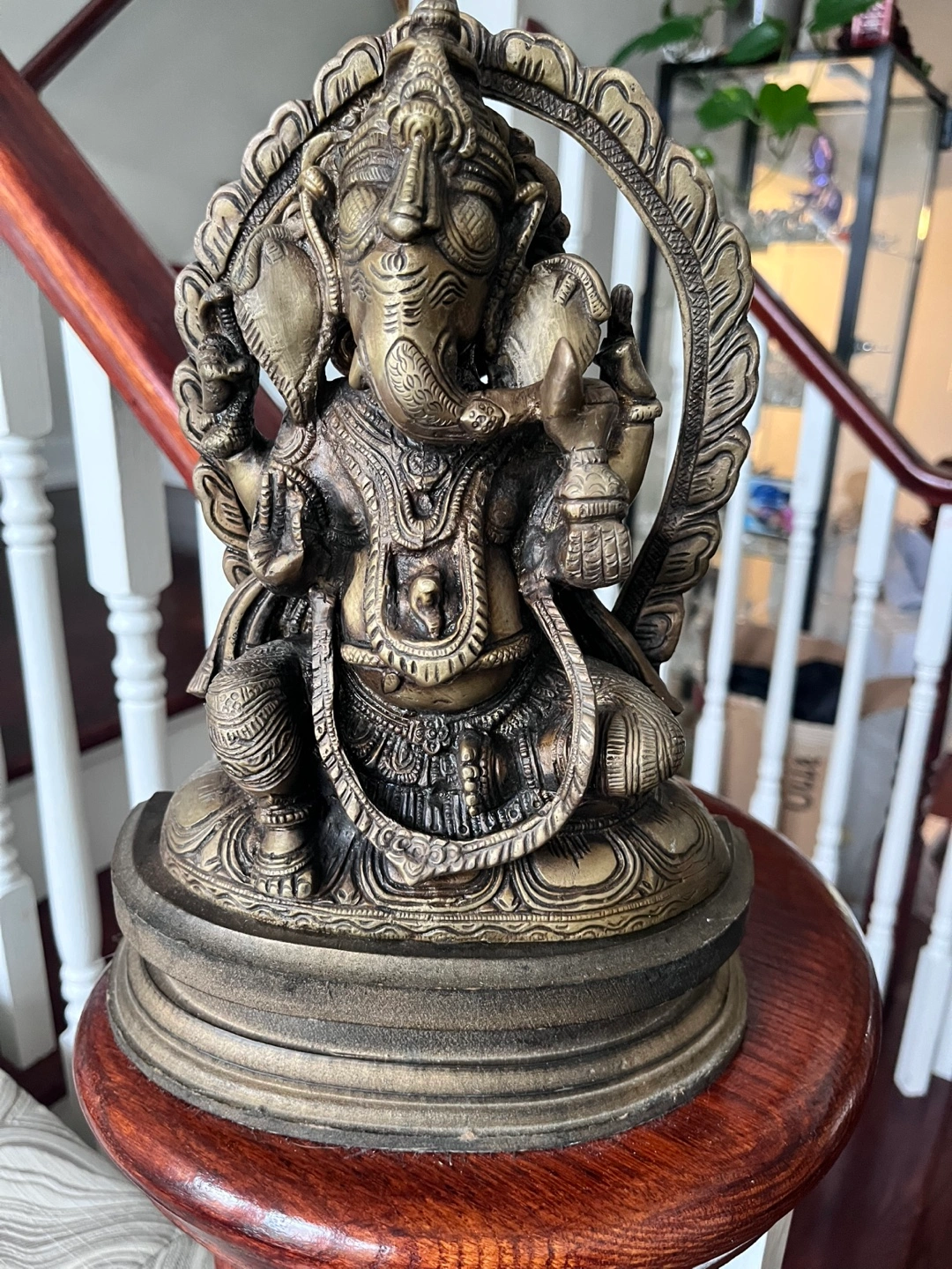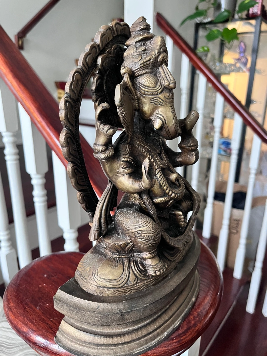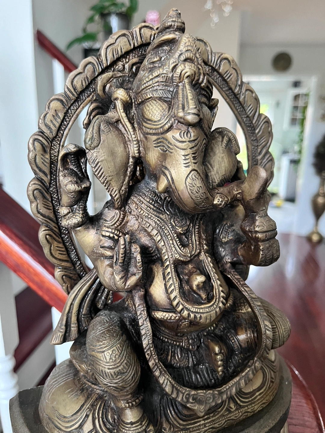Brass statue of Ganesha. Intricate detailing throughout. Includes a decorative halo around the head. Place this beautiful statue in a calming corner for daily reflection.