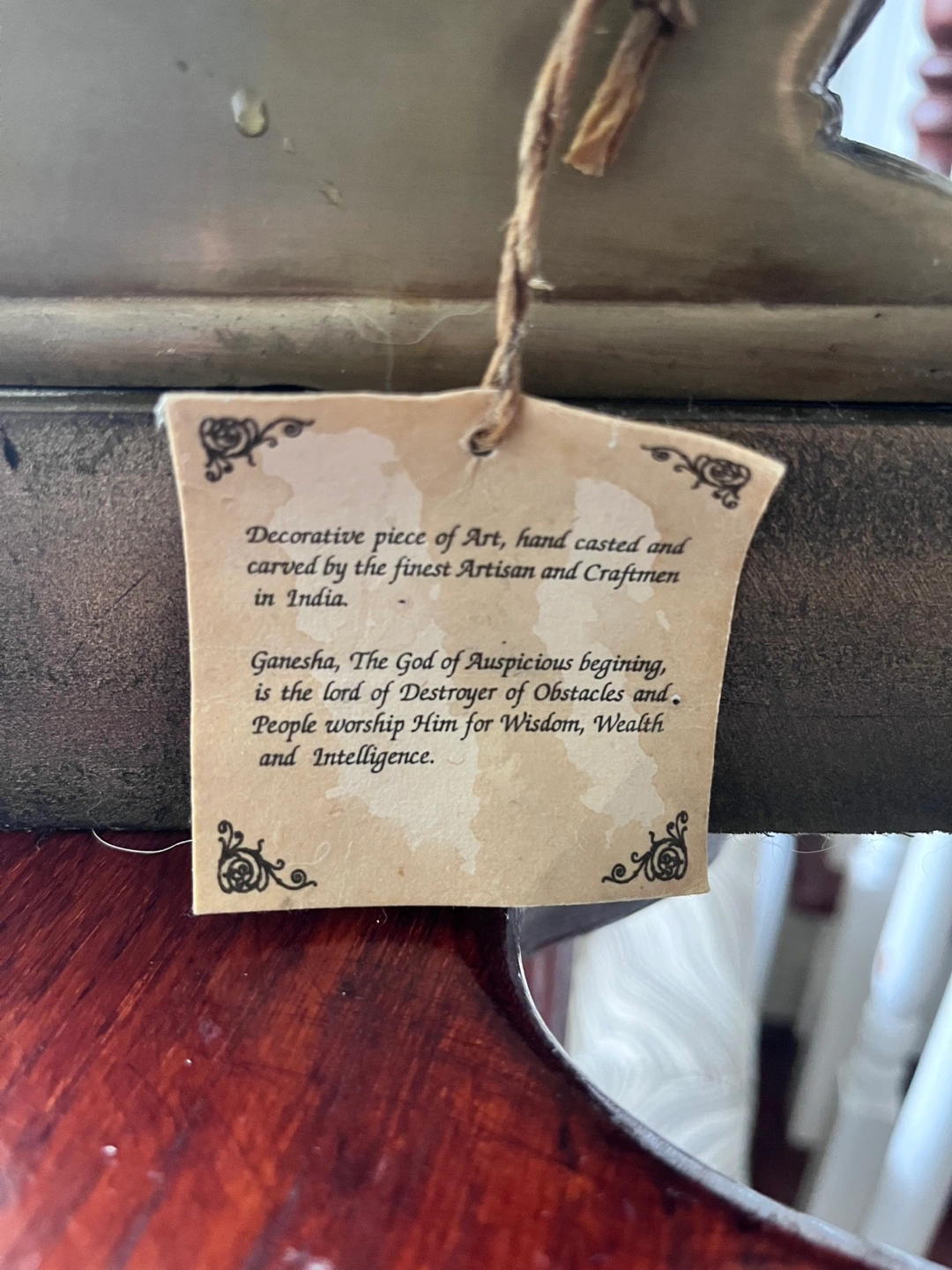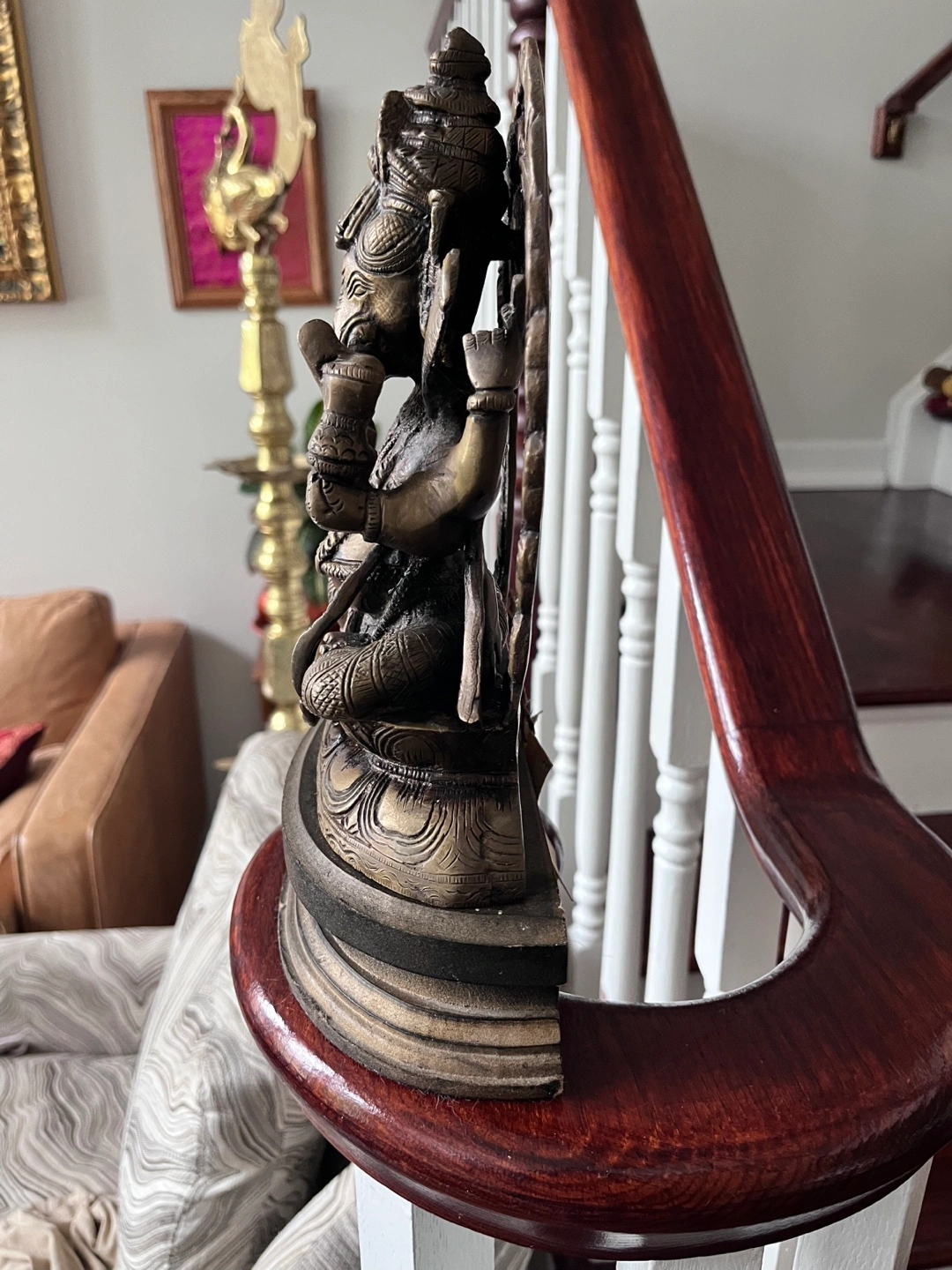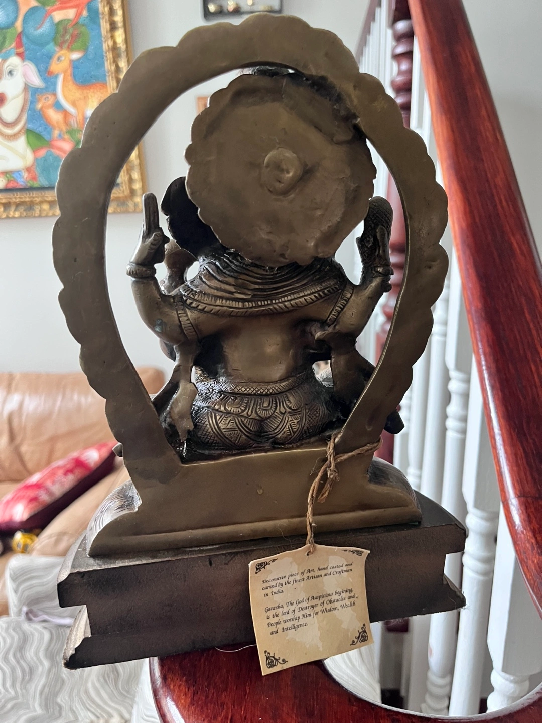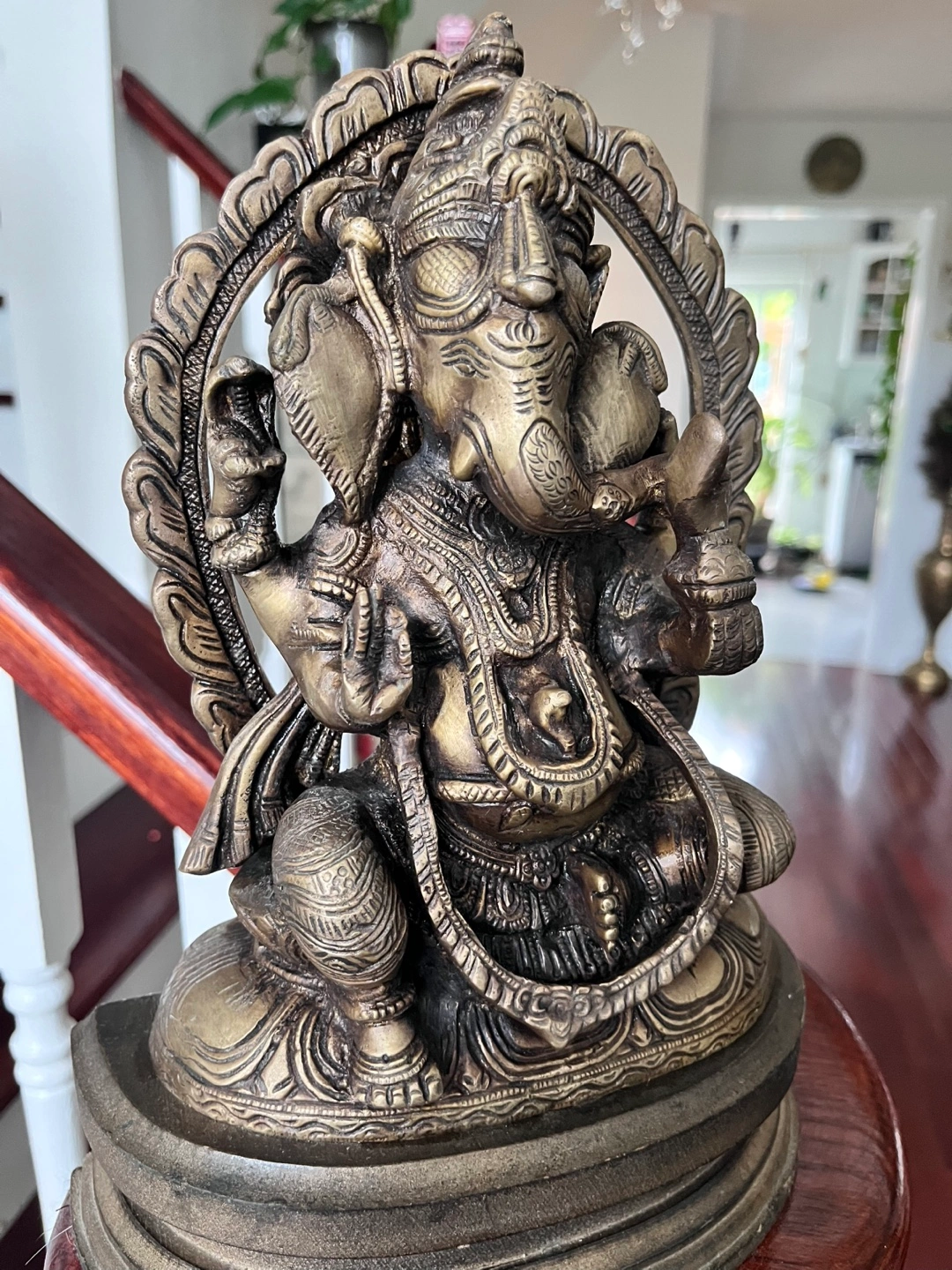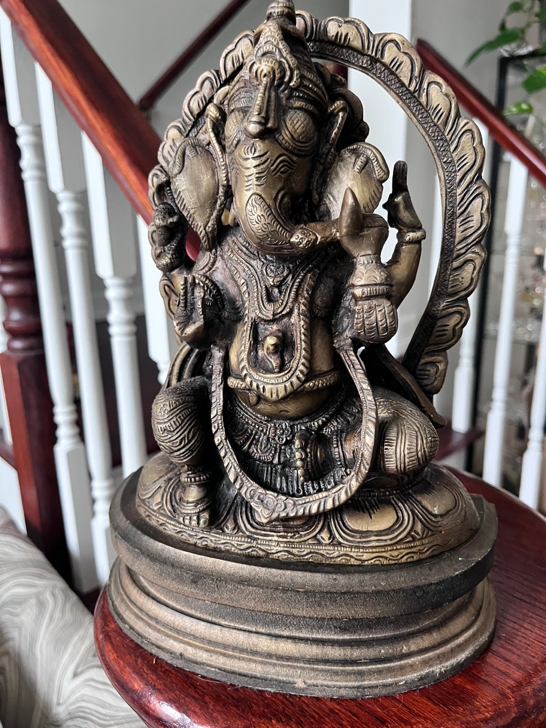 Brass statue of Ganesha. Intricate detailing throughout. Includes a decorative halo around the head. Place this beautiful statue in a calming corner for daily reflection.