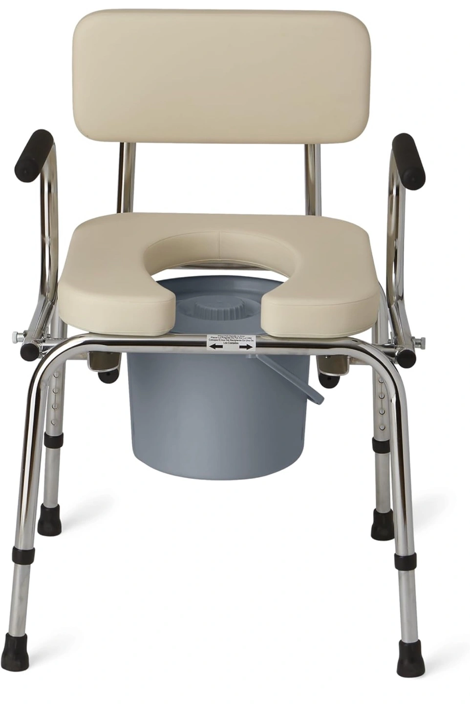 106Commode chair with a padded seat, backrest, and armrests. Constructed with a metal frame. Includes a removable pail. This commode chair can bring you a sense of ease and security.