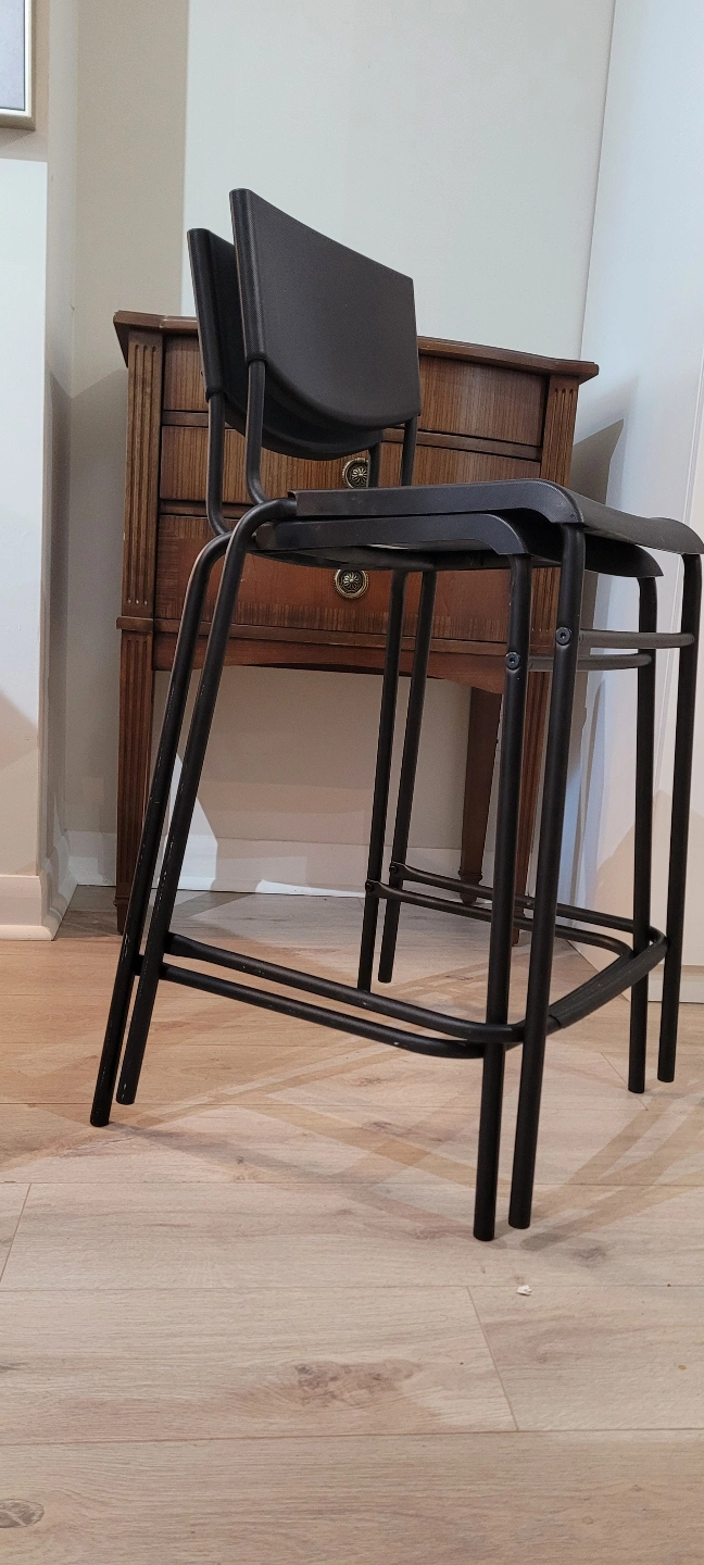 1 black bar stools with a black seat and back. Metal frame has a footrest. This stool is a great addition to your kitchen.