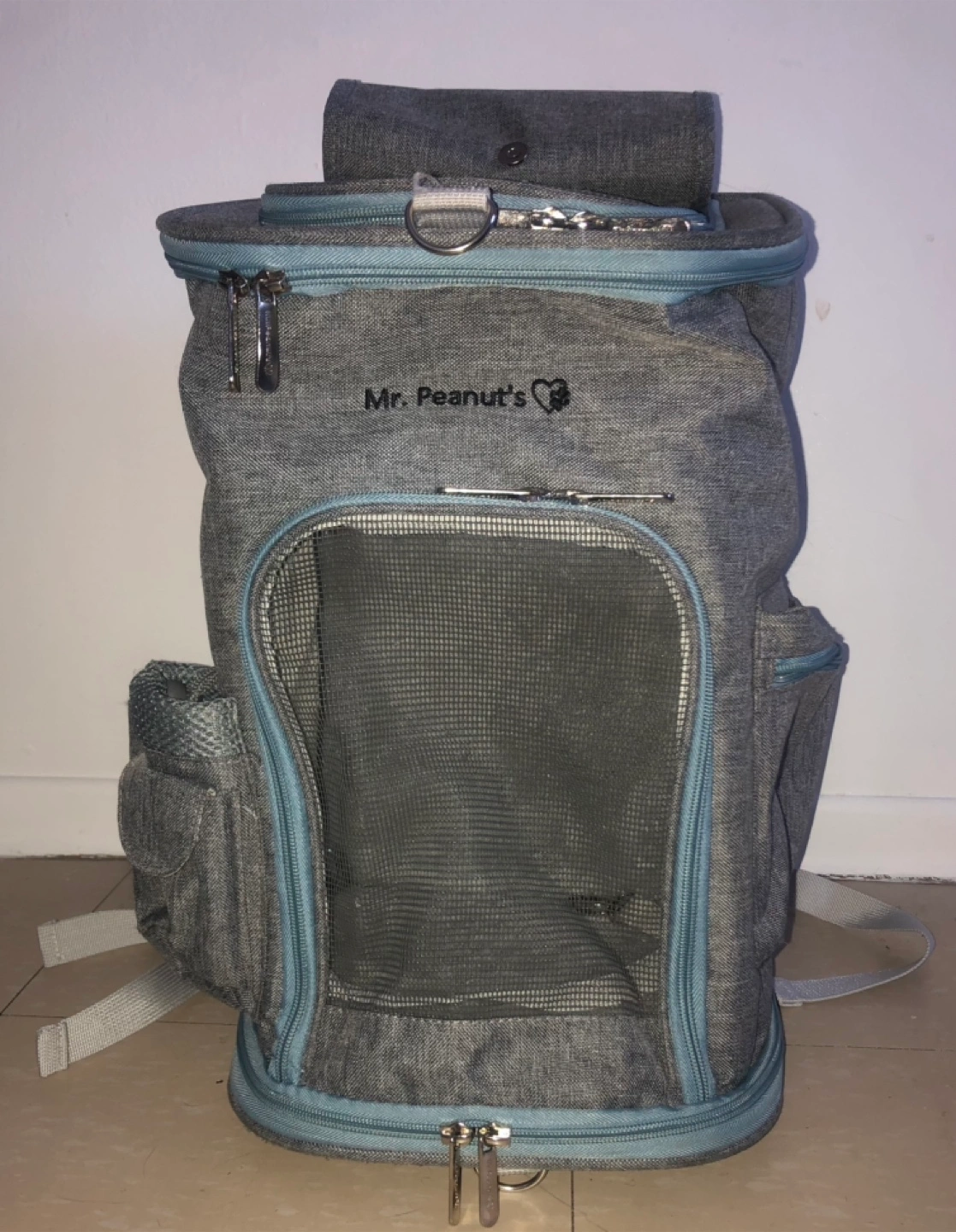 By Mr Peanuts brand. The colour is grey and light blue. Can fit a small animal.