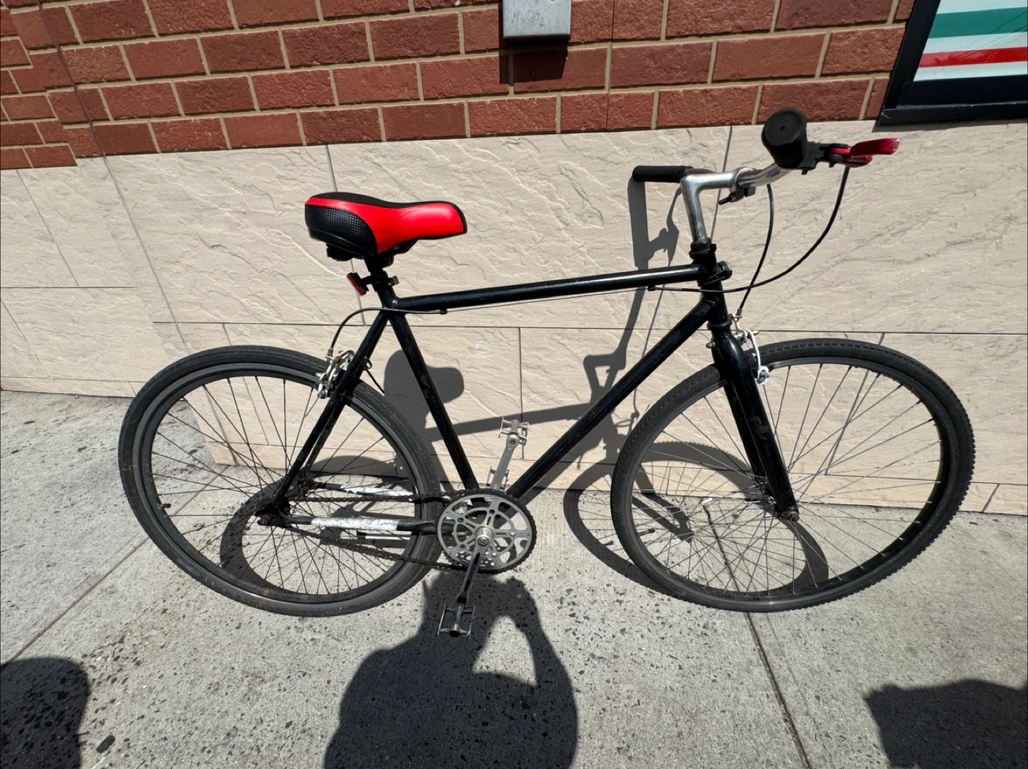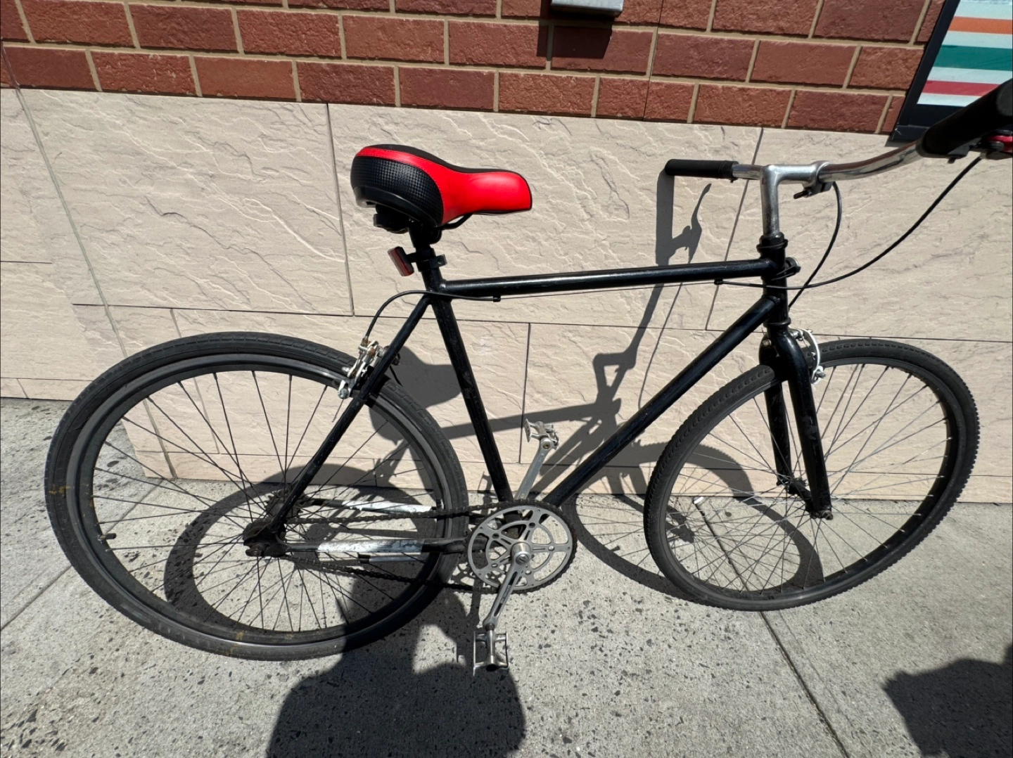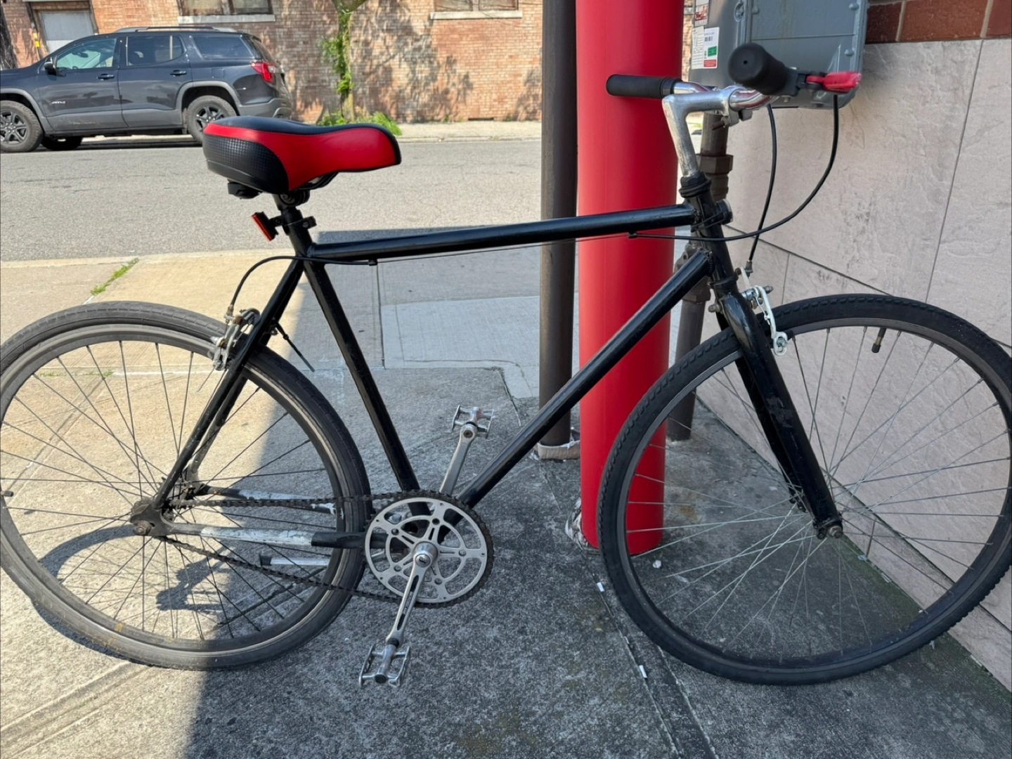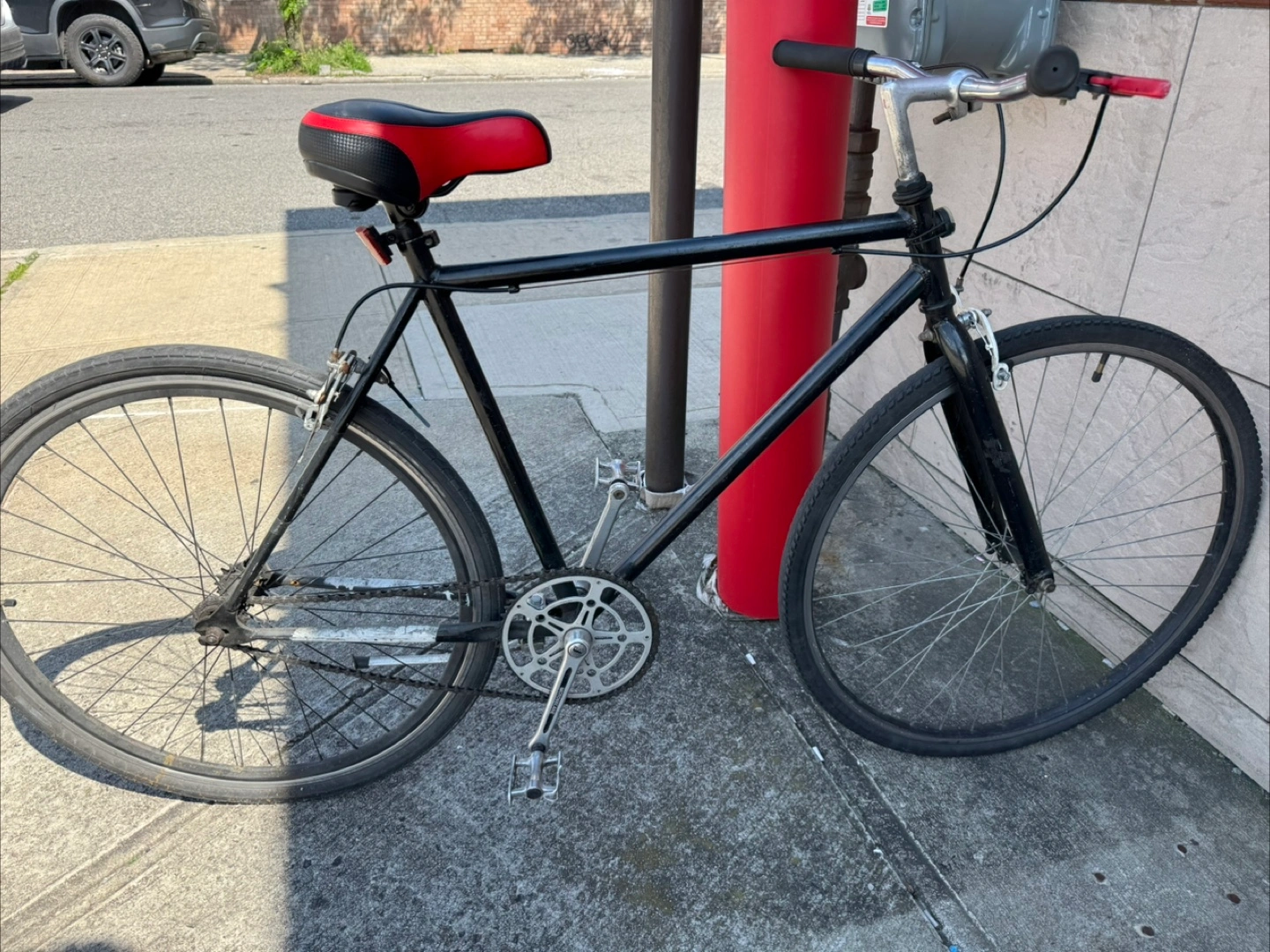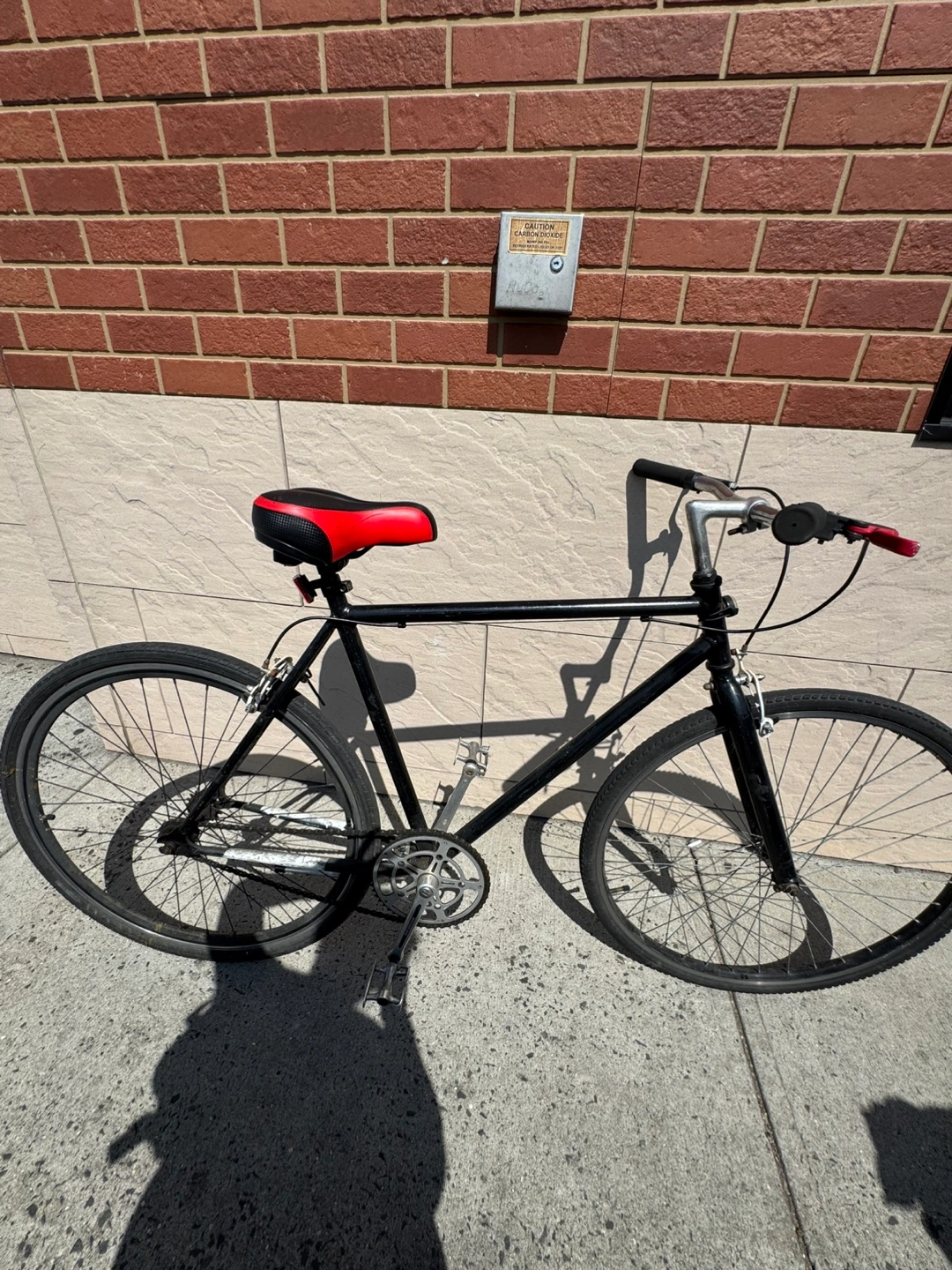 Black frame bicycle. Features red and black seat. The tires are black and the handle bars are silver. Taking it for a ride can be a great way to enjoy the day.