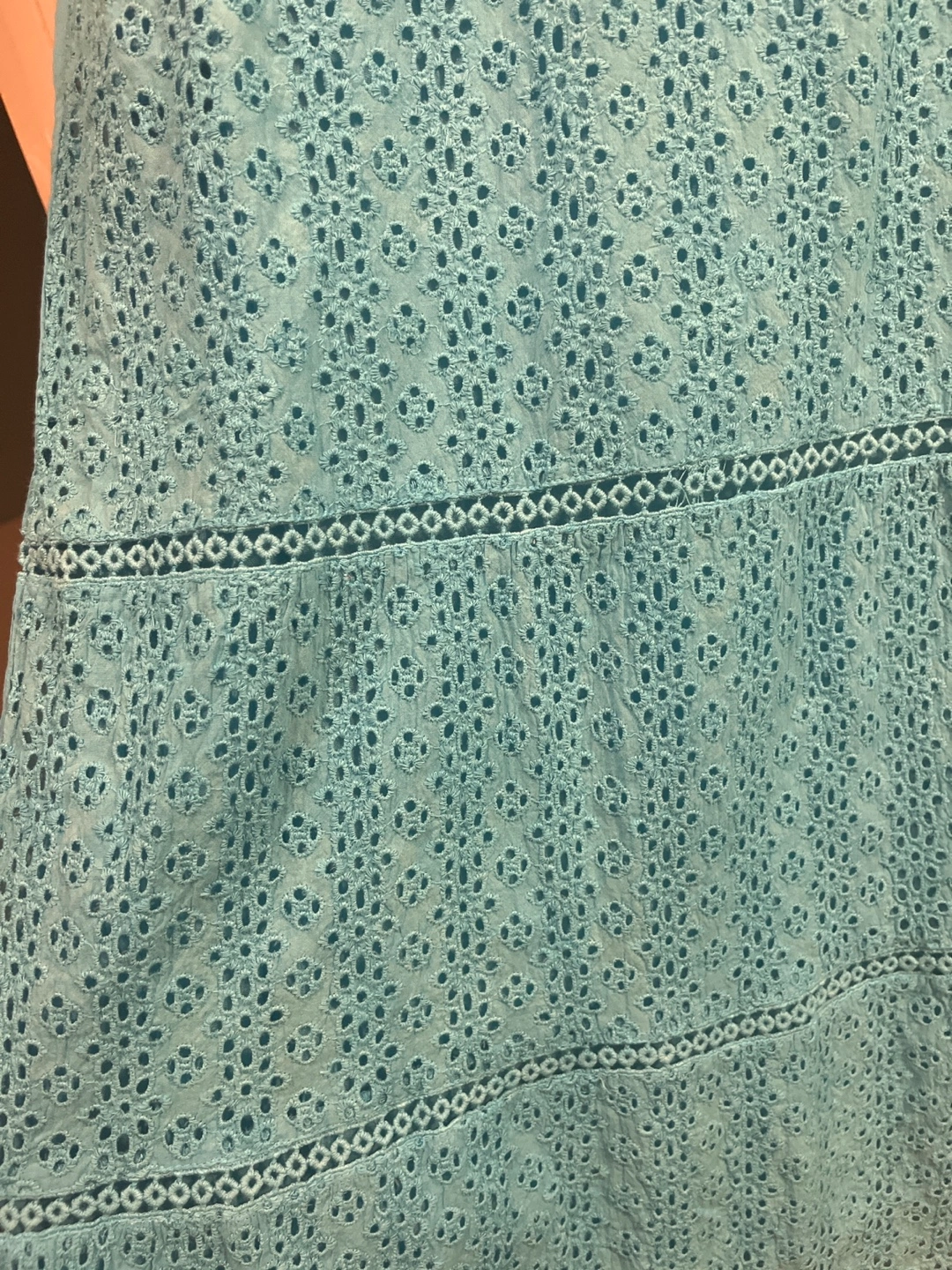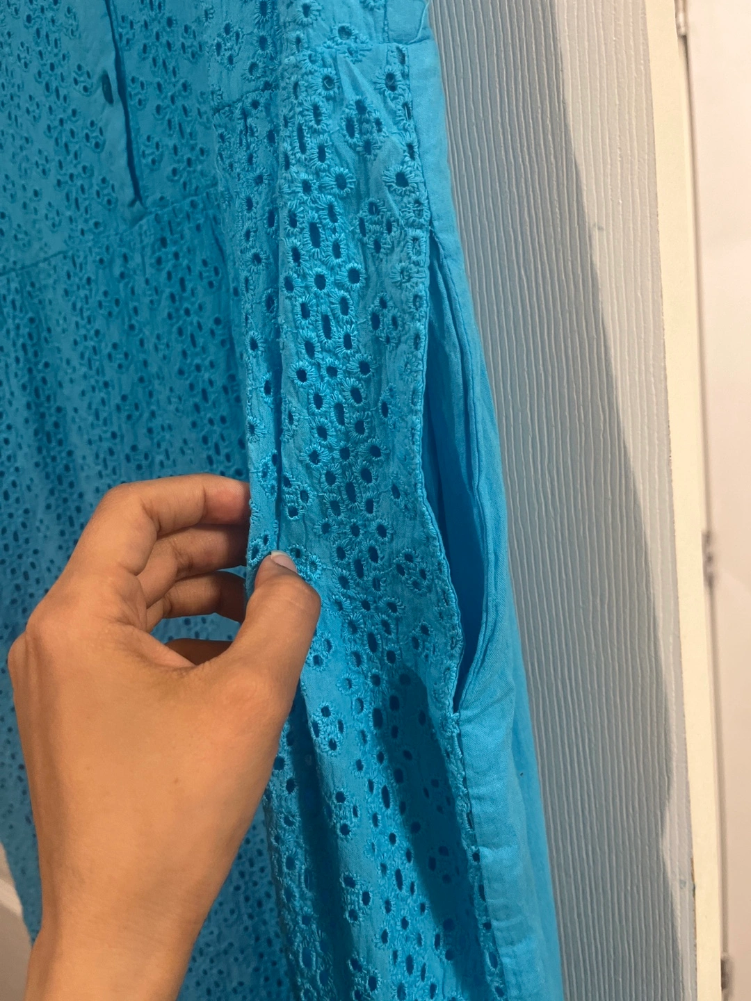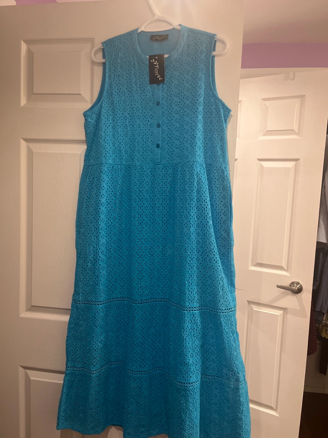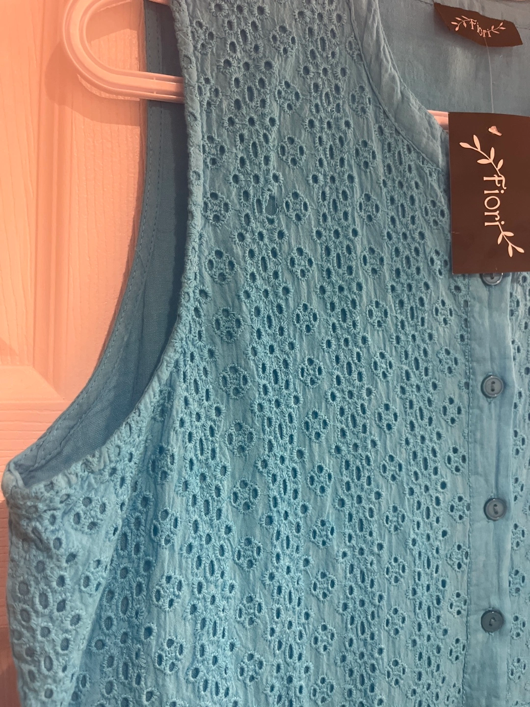Sleeveless dress in a vibrant blue. Features eyelet detailing throughout. Buttons down the front. Includes pockets. A perfect dress to wear on a warm summer day.