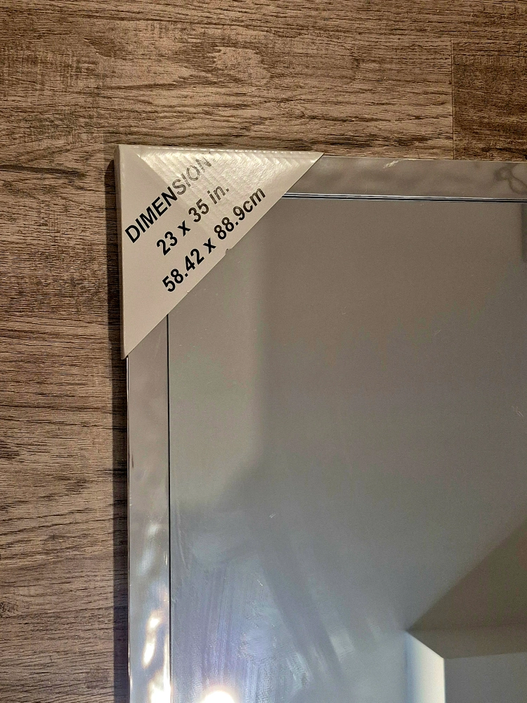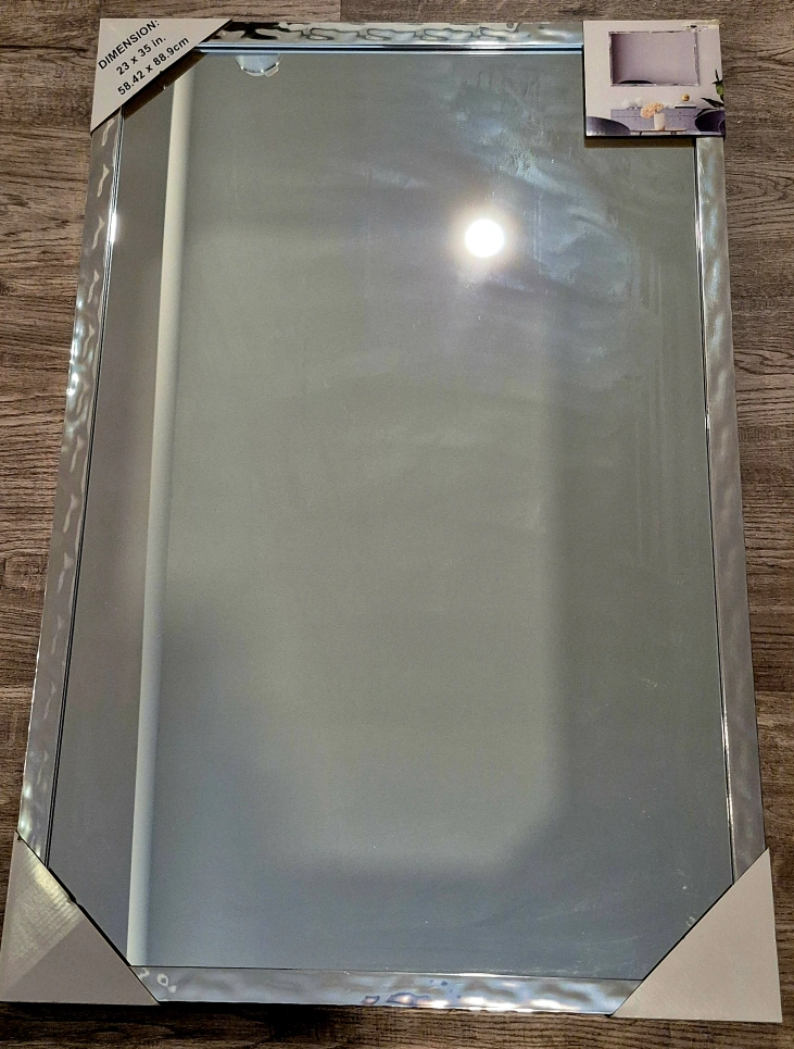 70Large rectangular wall mirror. Silver frame with detailed edges. Would look nice in a bedroom or living room.