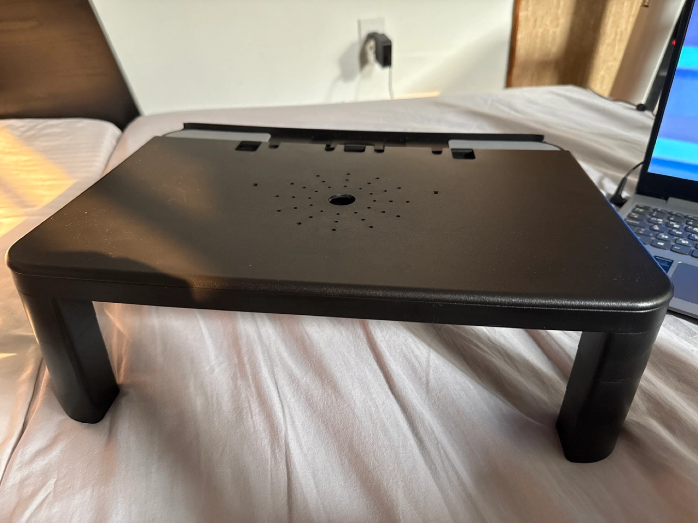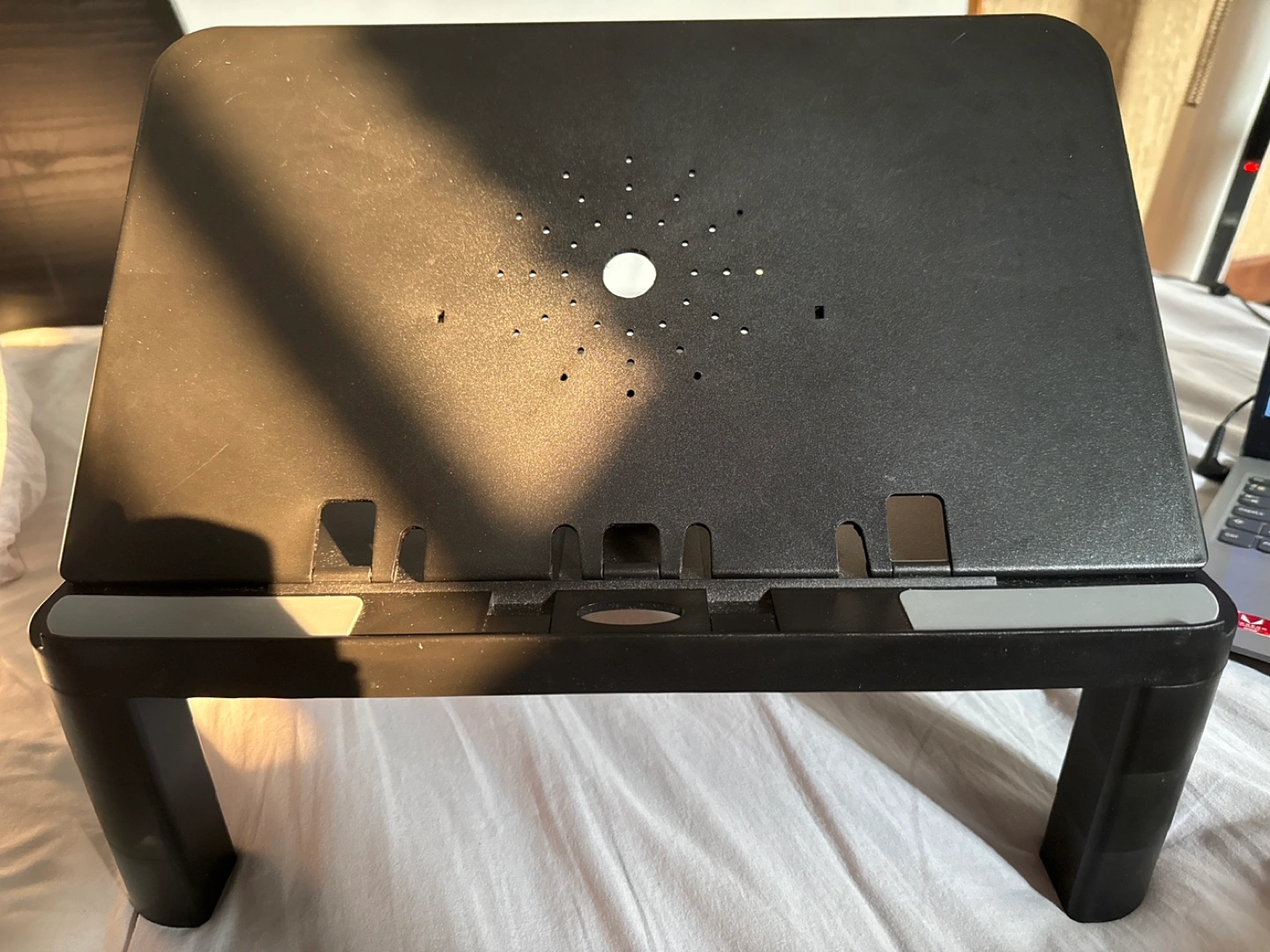 A black laptop desk. It features a rectangular surface. There are several holes in the middle. The item has two black legs on either side. It can be a great place to relax with a movie or work comfortably from your bed.