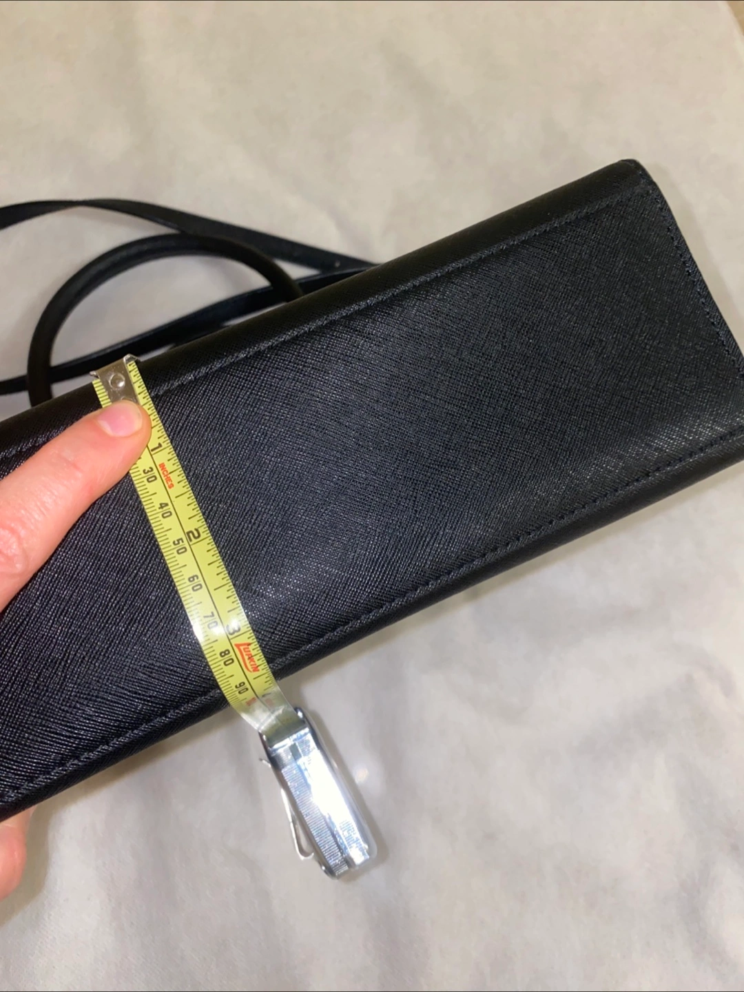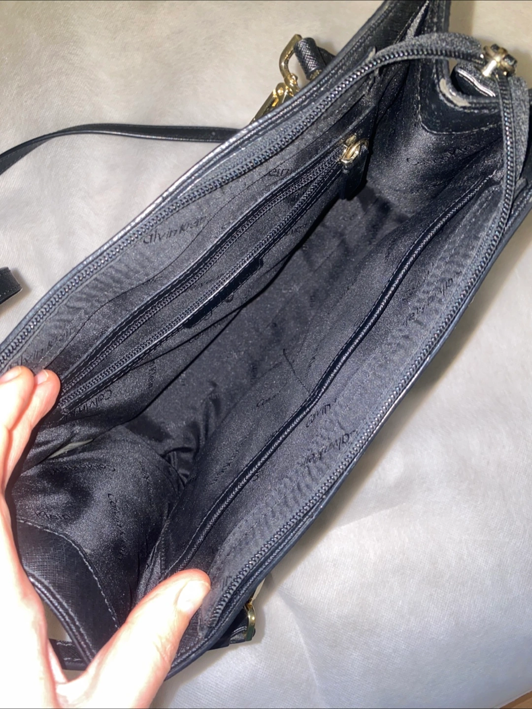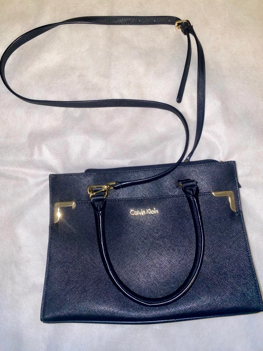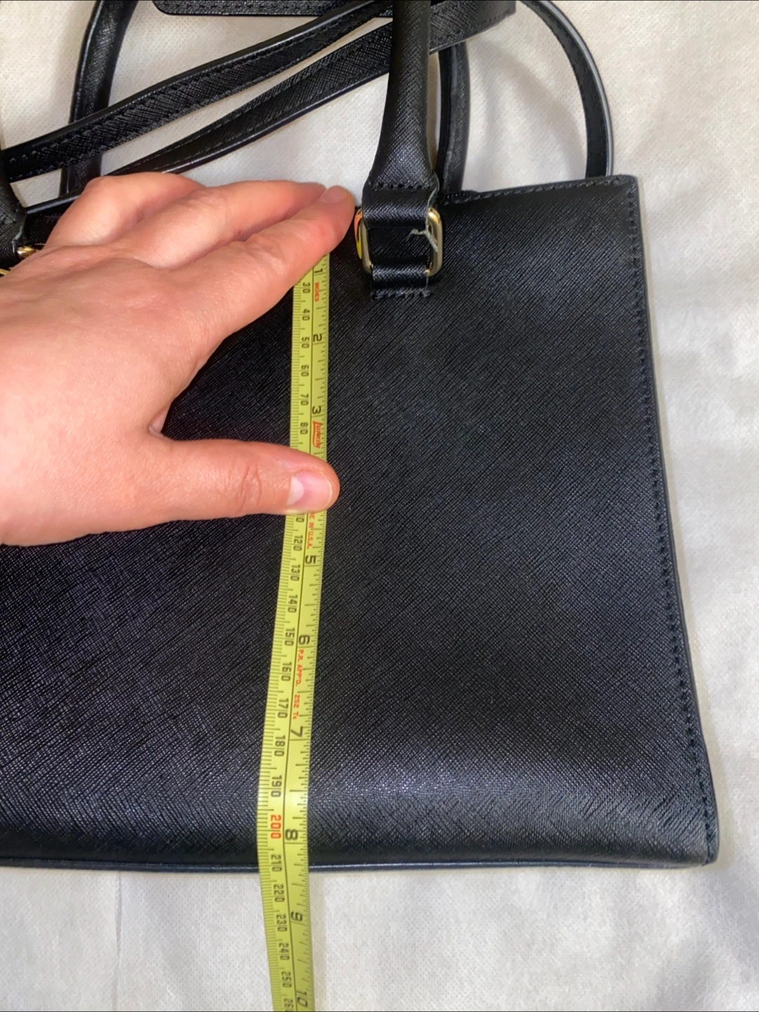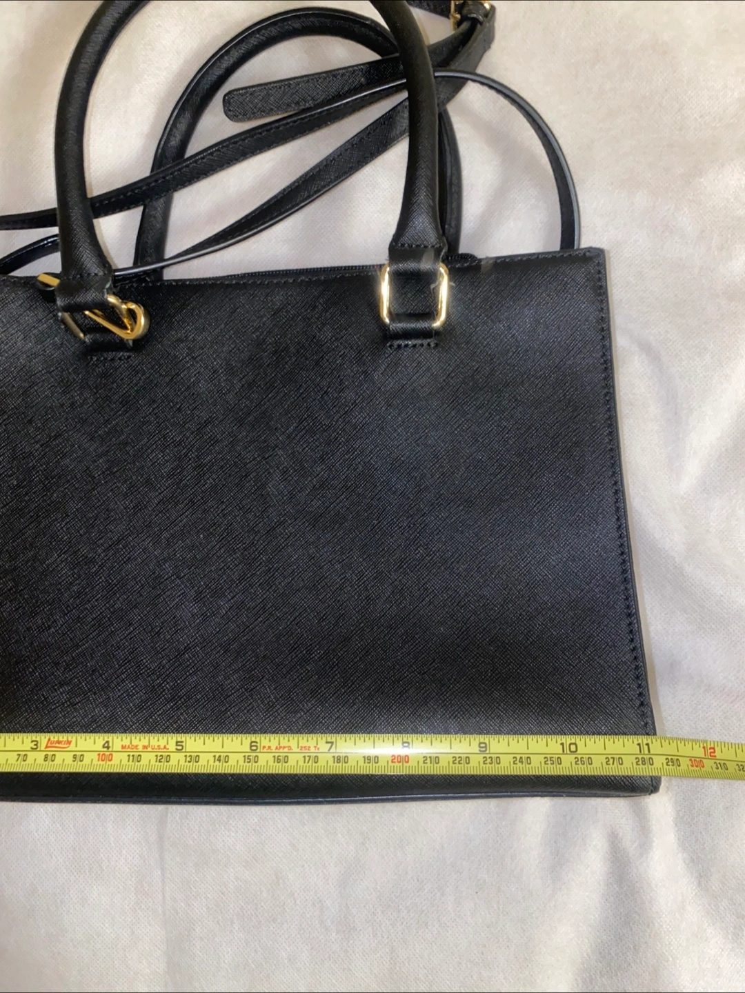 949A black bag with gold-toned accents. The bag features two handles and a removable shoulder strap. Interior shows multiple compartments. A great bag for everyday needs.