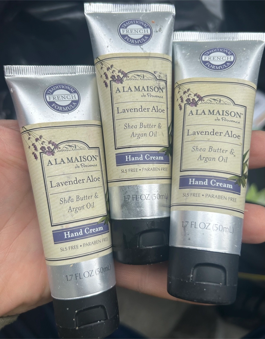 Lavender Aloe hand cream or lotion with shea butter and argan oil. Great for daily use to keep your skin moisturized. The packaging is simple with details of lavender flowers and leaves. Set of 3