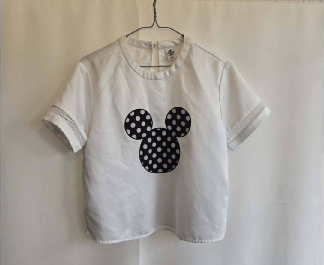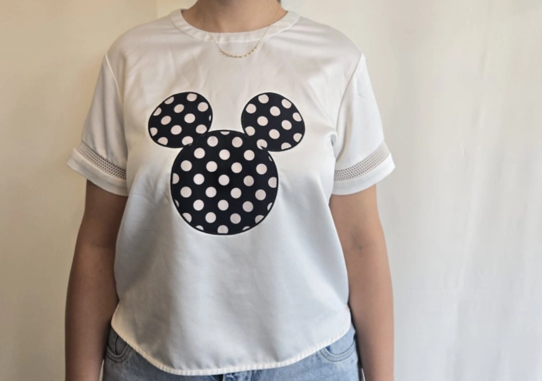 A white top with a Mickey Mouse design. Short sleeves with mesh detailing. You could wear this for a casual day out, feeling relaxed and comfortable.