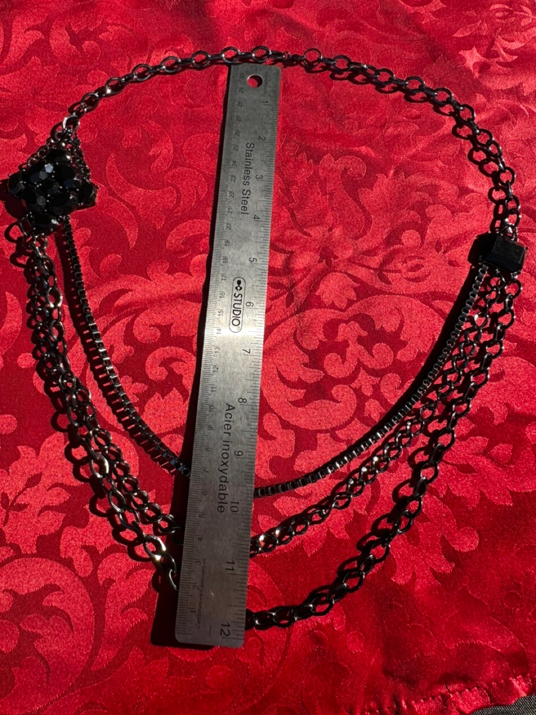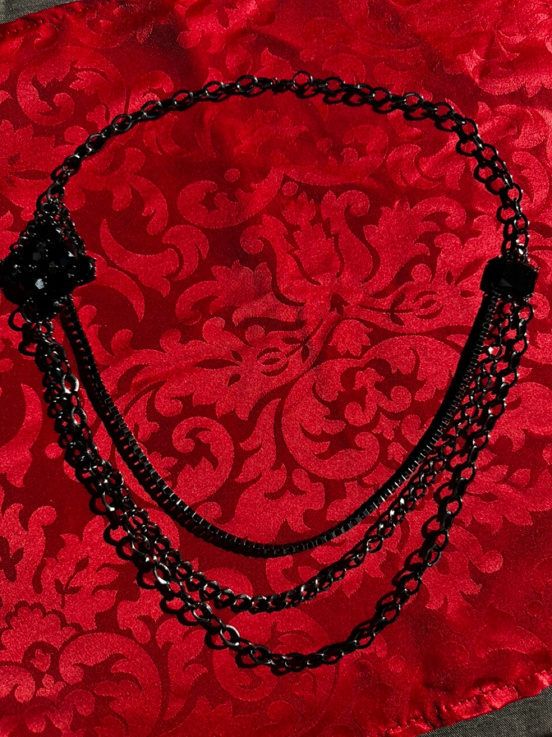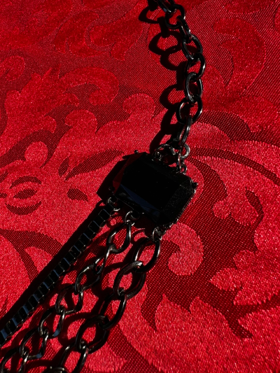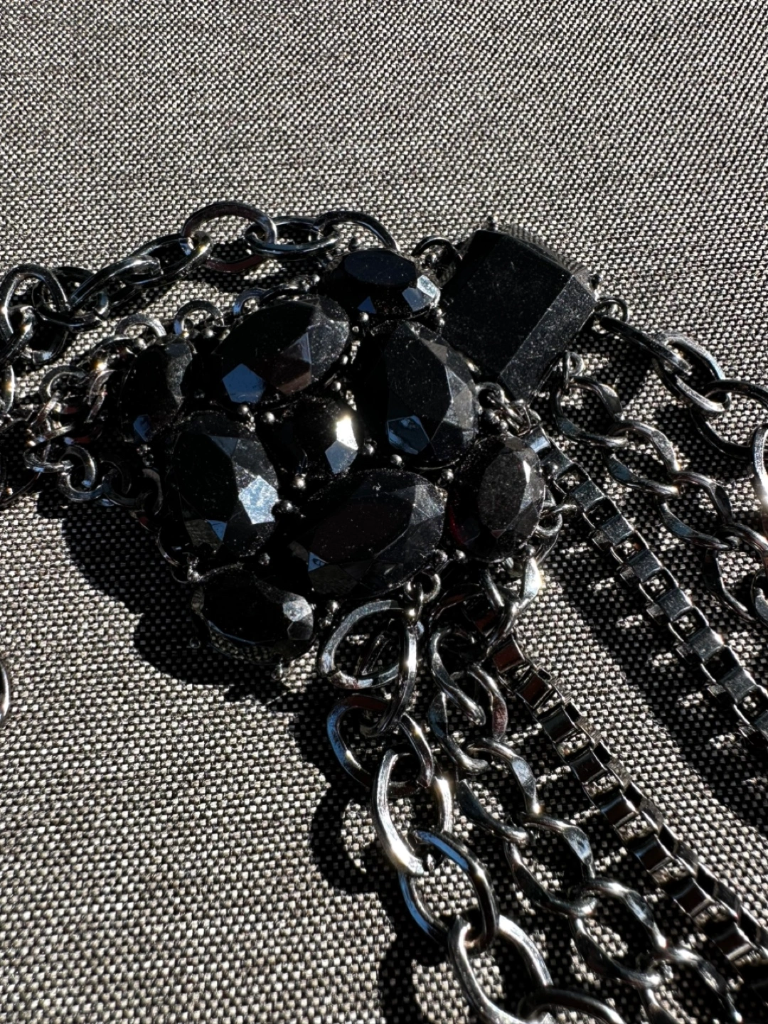 Beautiful chain necklace. Several chains connected together. Central piece has a cluster of black, shiny stones. Wear it for your next night out, or for a quiet evening at home. Chunky big necklace.