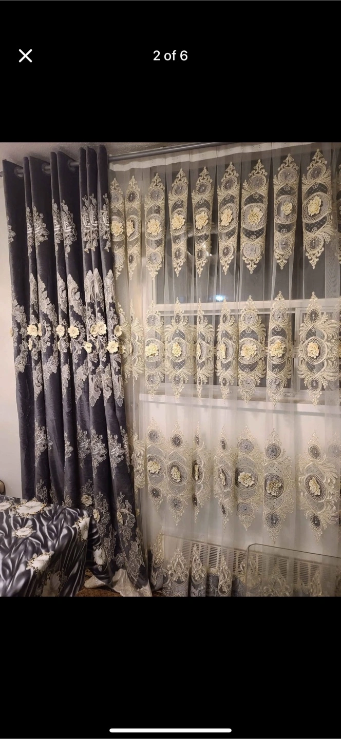 Gorgeous curtains, featuring delicate embroidery. Dark grey drapes and a sheer, cream-colored panel. The intricate detailing adds a touch of elegance. These curtains will make any room feel peaceful.