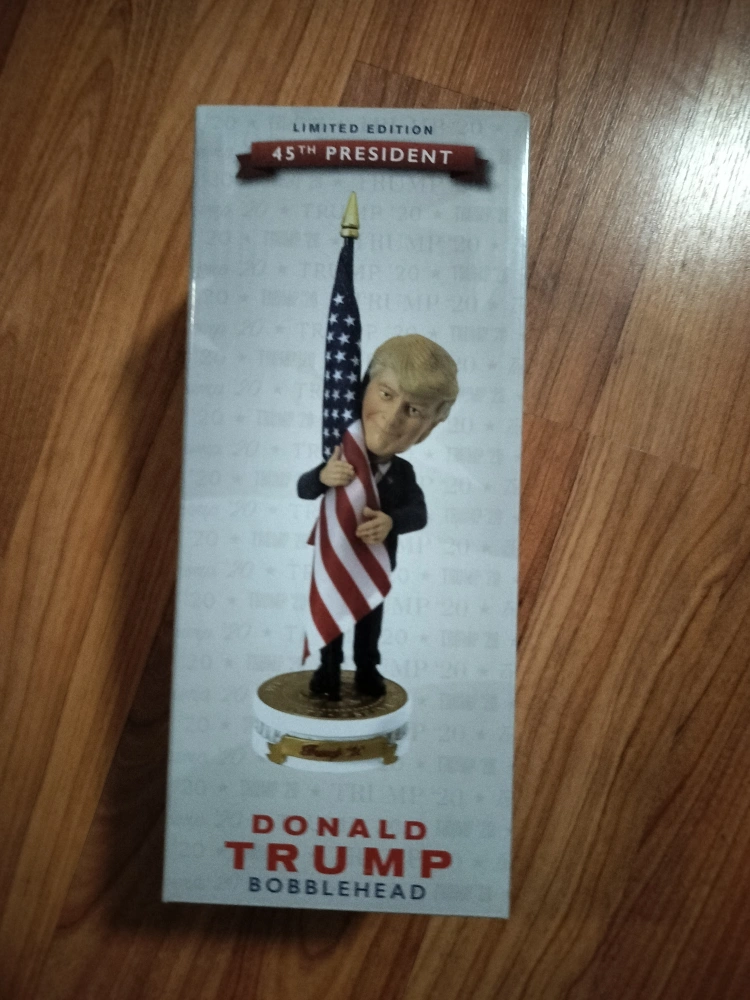 Limited edition bobblehead. Features an image of Donald Trump. The box includes a brief biography. Placing this on your desk will bring a unique touch to your space.