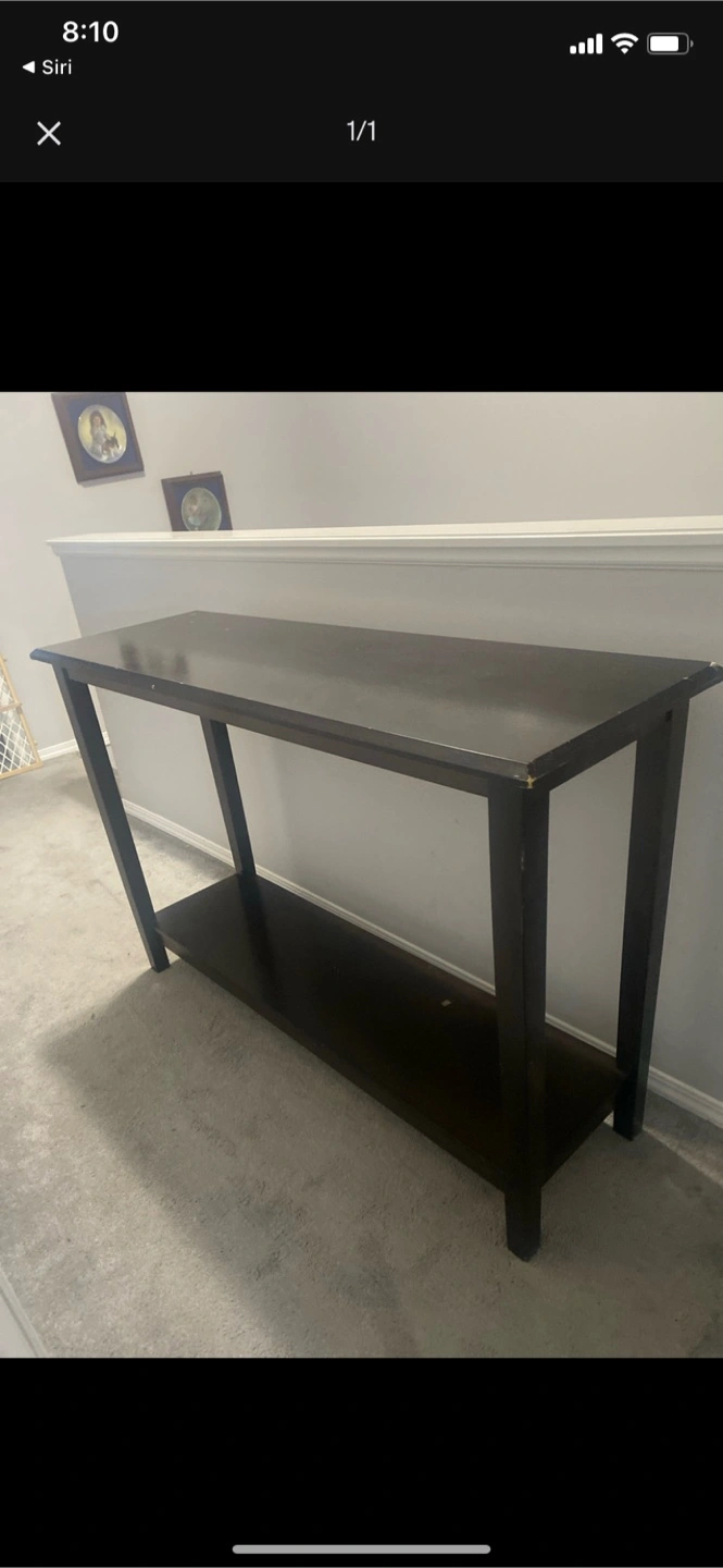 The console table is a dark brown colour. It has a flat tabletop. Underneath, is another shelf. It is long and thin. A beautiful place to set up your home decor.