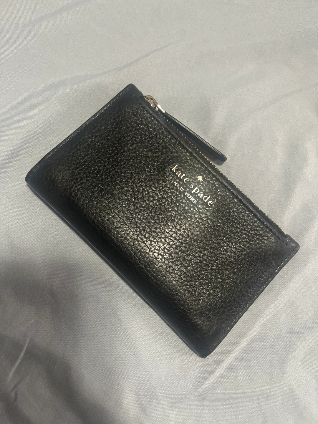 Black wallet with zipper closure. Includes card slots and a snap closure. Interior card slot with clear plastic. Perfect for keeping your important things organized and accessible at all times.