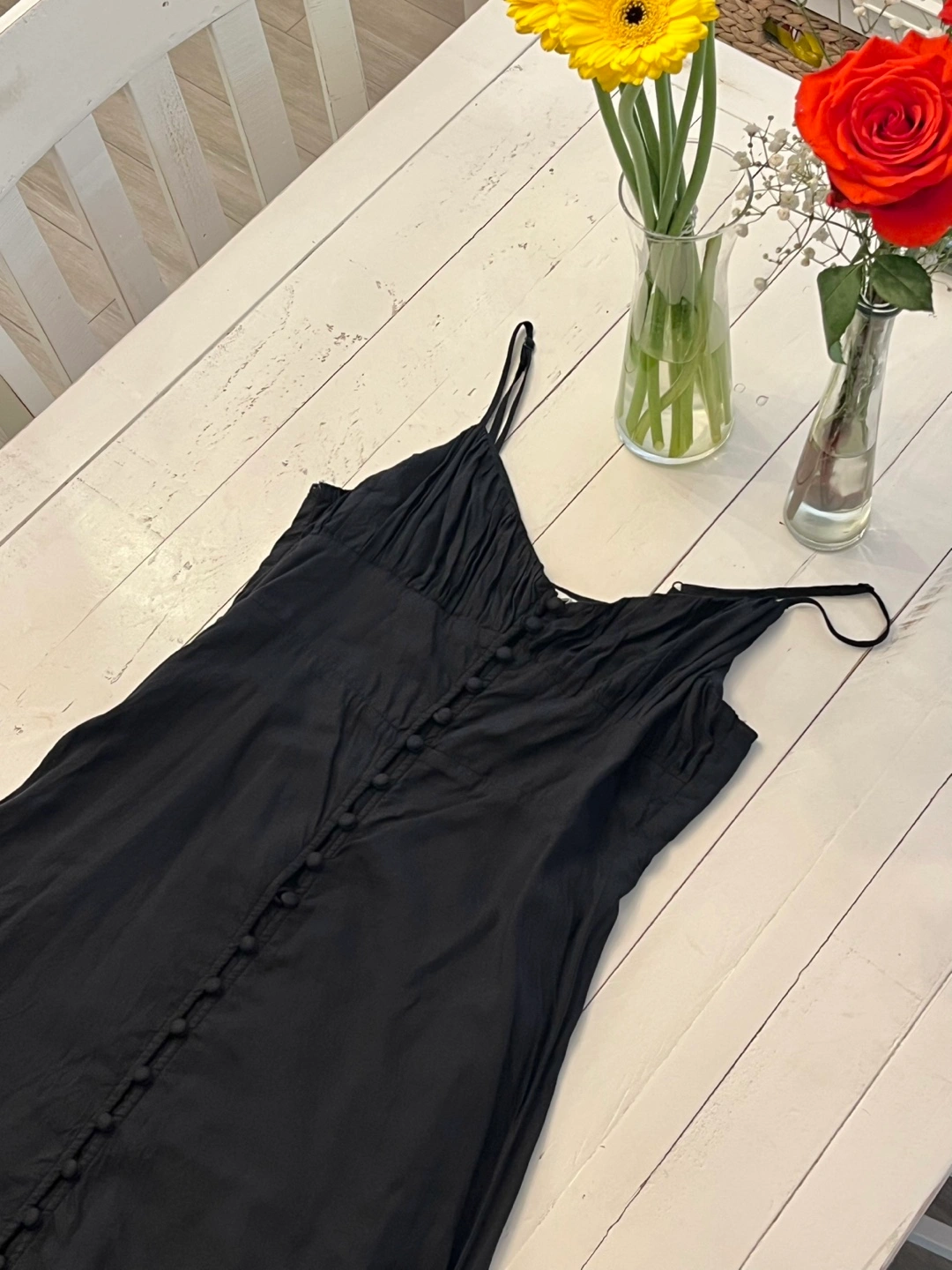 Features a fitted bodice with a gathered neckline and a row of buttons down the front. The dress has adjustable spaghetti straps and a ruffled hem. Perfect for a day spent wandering through a garden.