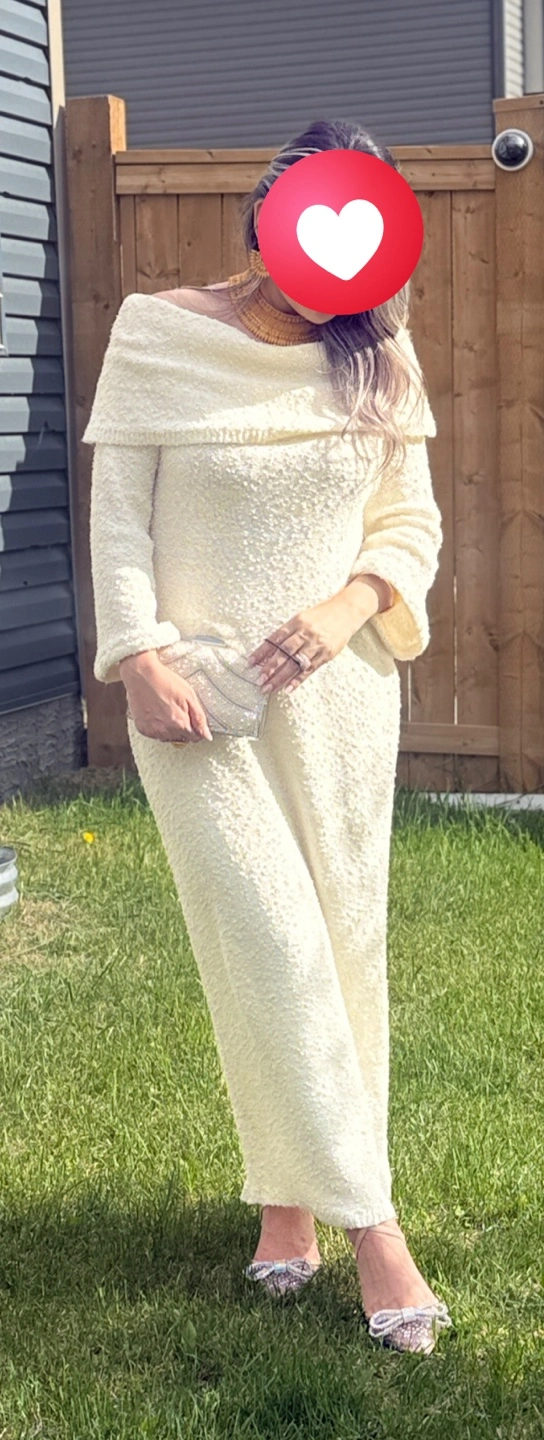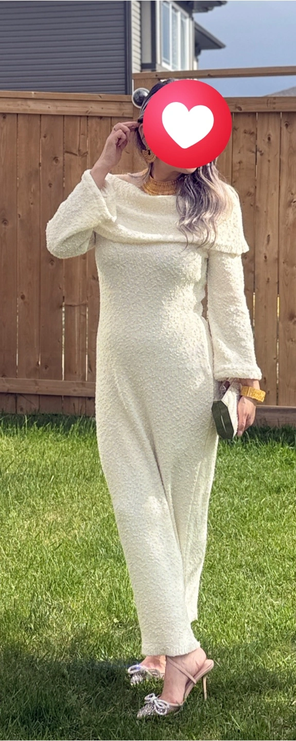 Lovely off-white dress. Features long sleeves and a boat-style neckline. Perfect for a special occasion where you can enjoy yourself and relax.