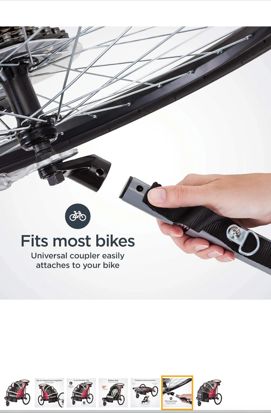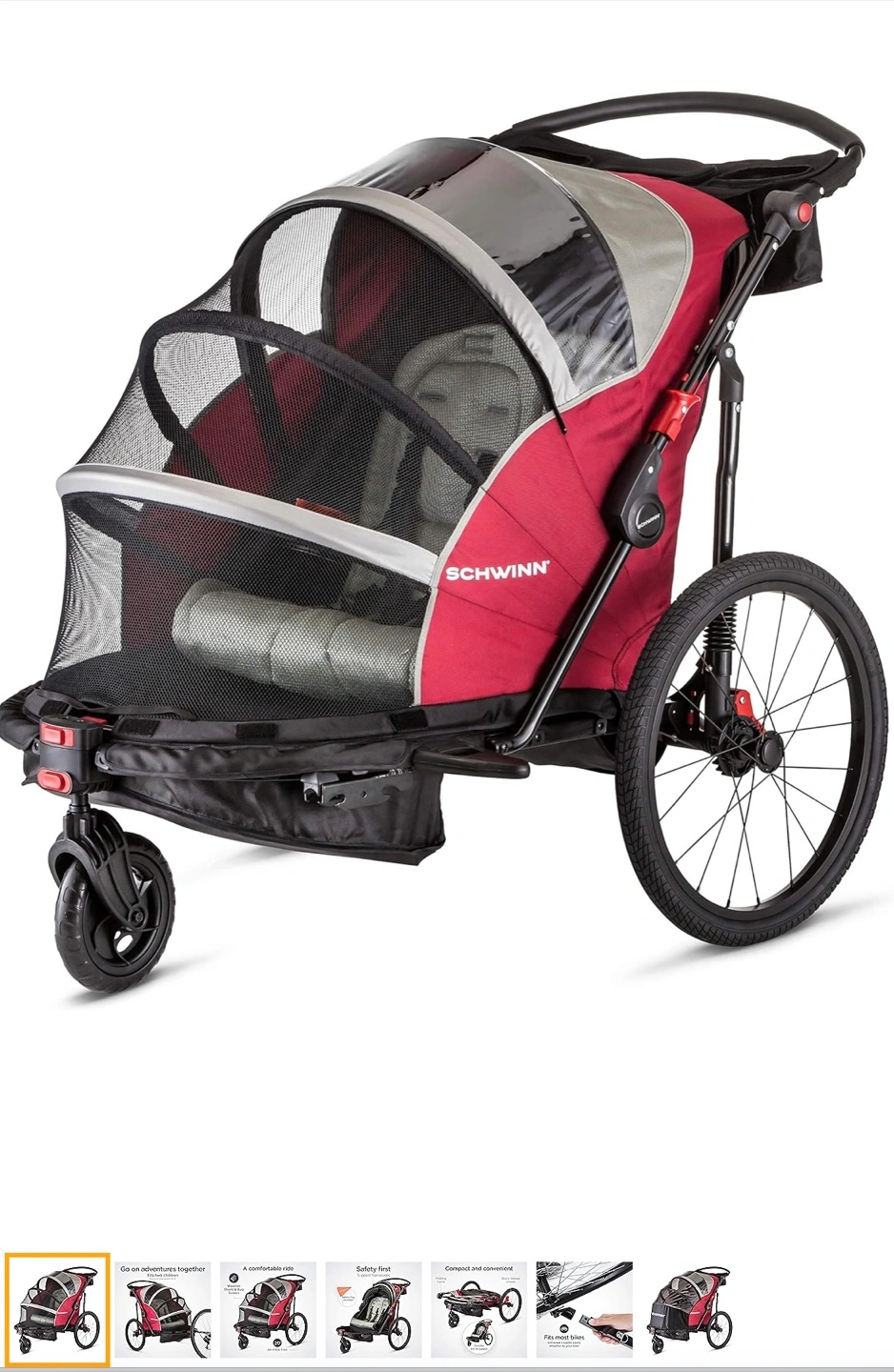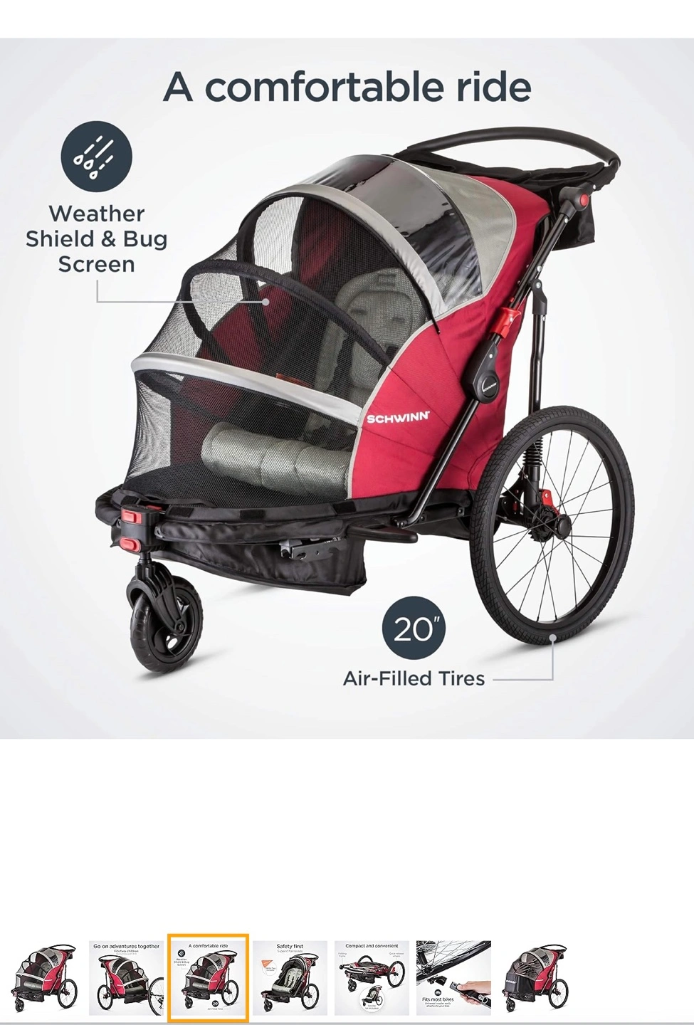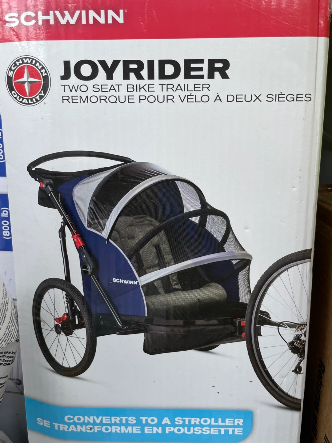 Brand New in box. Never opened. The trailer features a weather shield and bug screen. The trailer comes with 20" air-filled tires and a 5-point harness. It fits two children. This trailer will be sure to let you relax while you enjoy the world with your children.