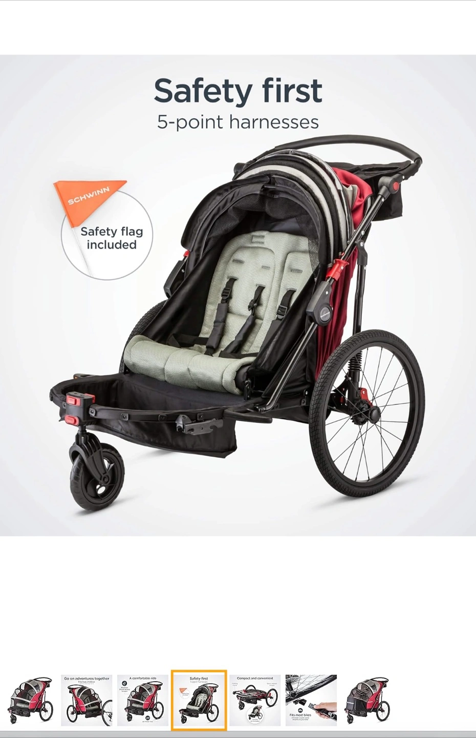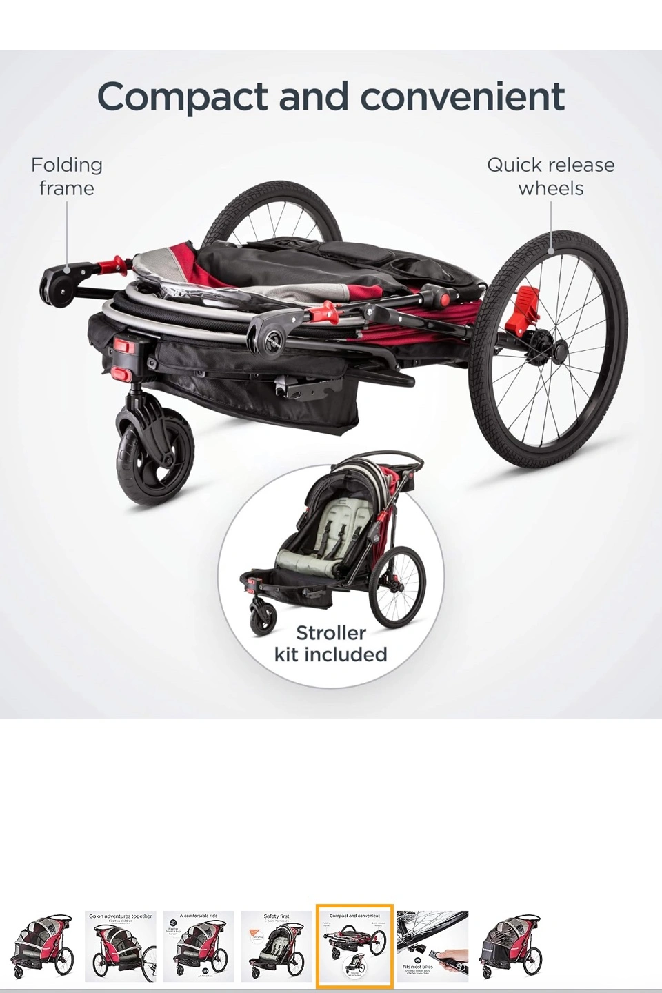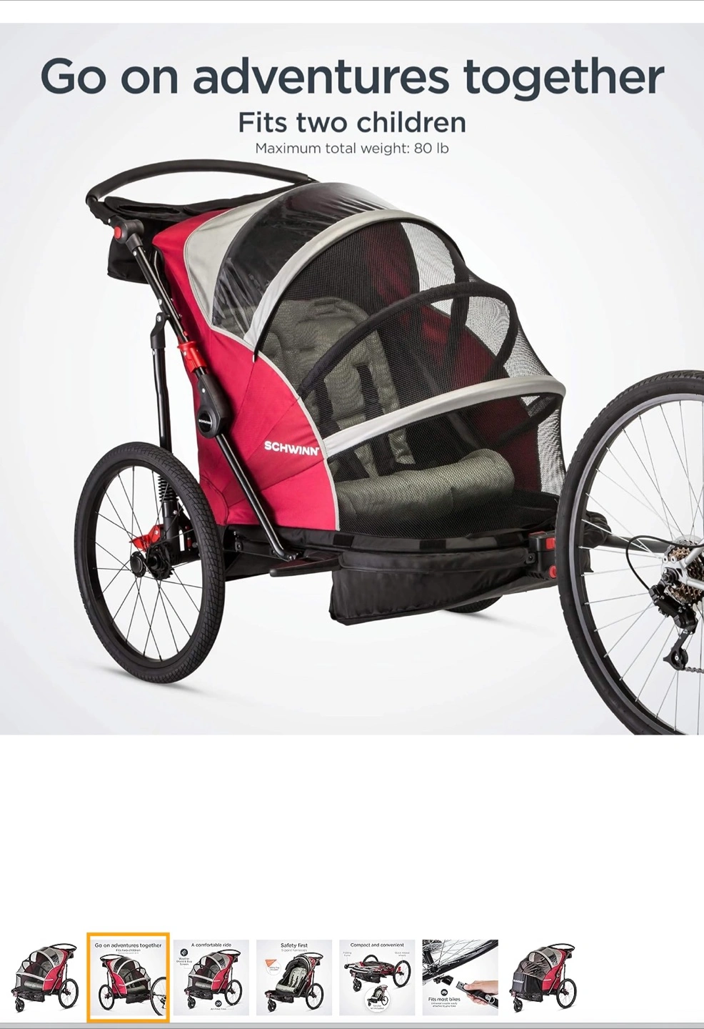 Brand New in box. Never opened. The trailer features a weather shield and bug screen. The trailer comes with 20" air-filled tires and a 5-point harness. It fits two children. This trailer will be sure to let you relax while you enjoy the world with your children.