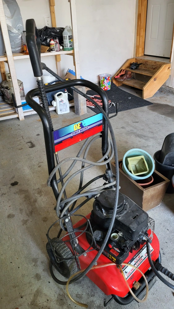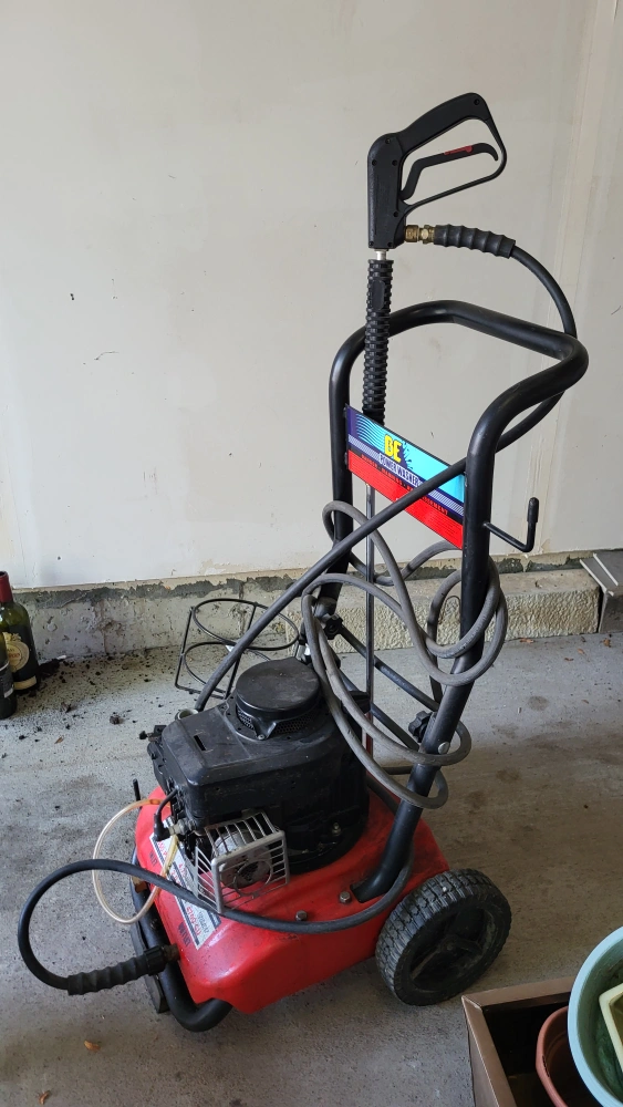 A red and black pressure washer. Features a black handle and a long hose. Would be a great way to relax while giving your home some extra shine.