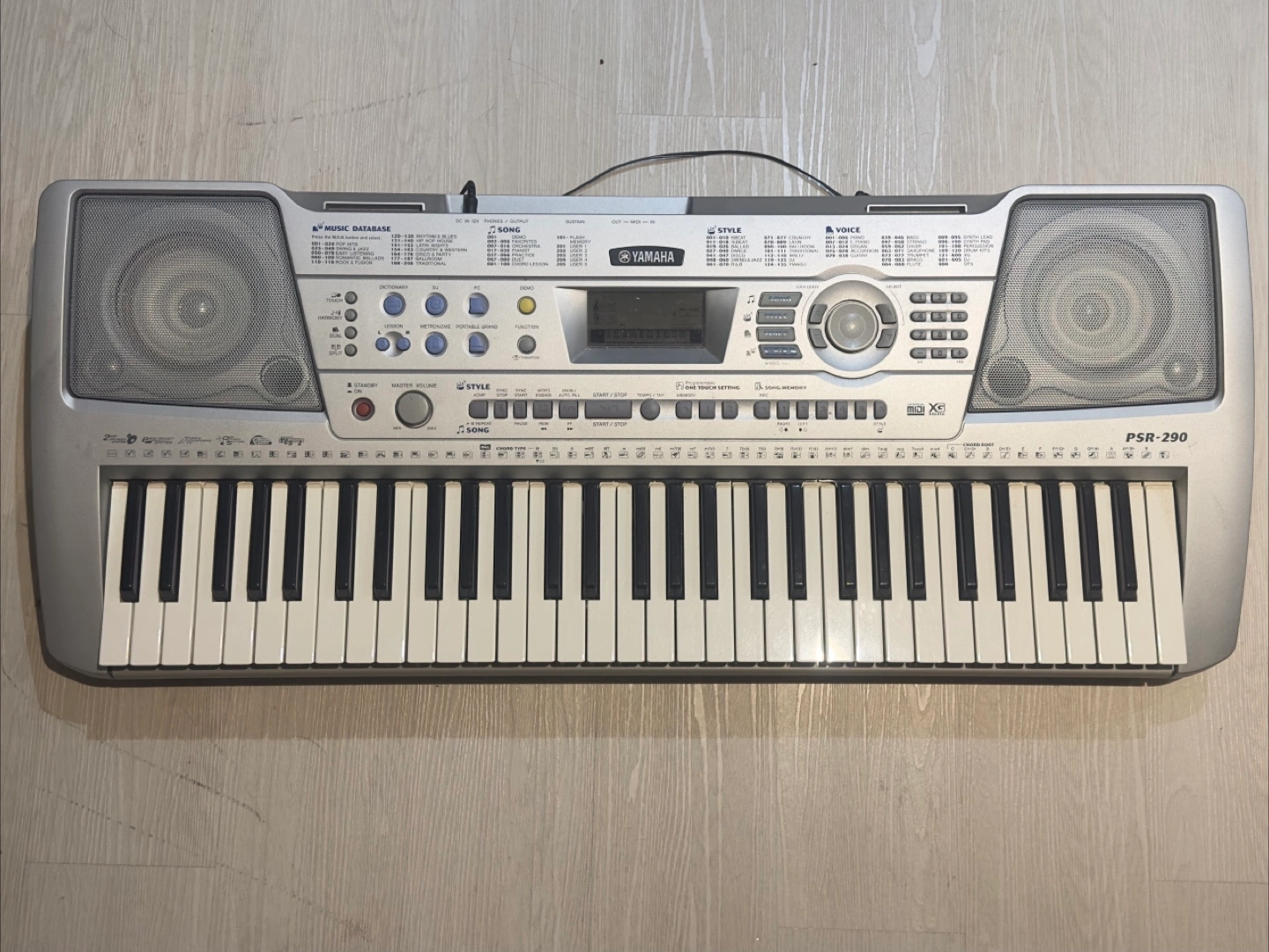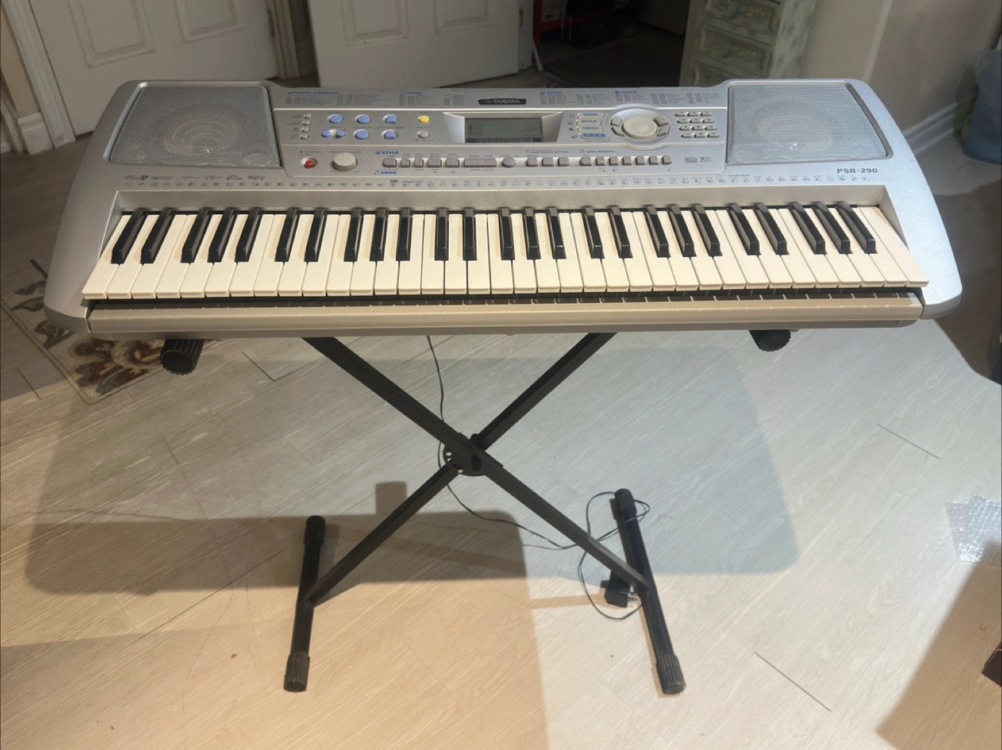A silver keyboard. Features keys, buttons, and speakers. A keyboard stand. This would be great to play when you want to relax after a long day.