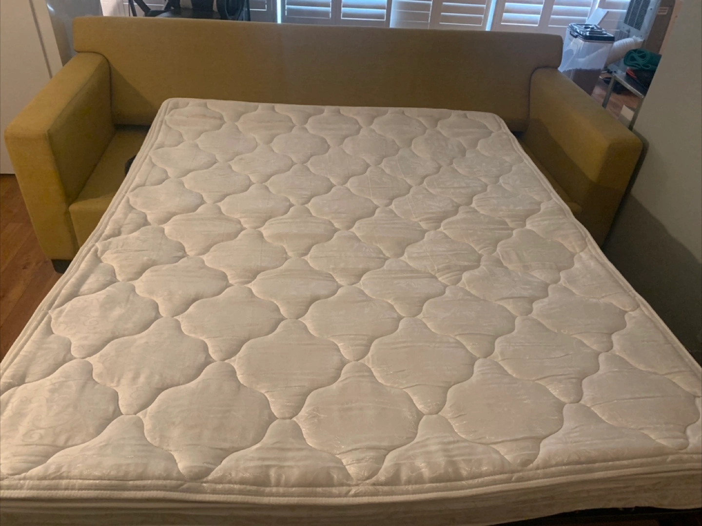 A yellow sofa bed. The sofa has three seat cushions. Two armrests. The mattress pulls out. Dog friendly home. You will need two people and a truck or large van to move.