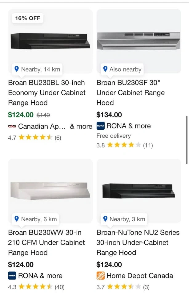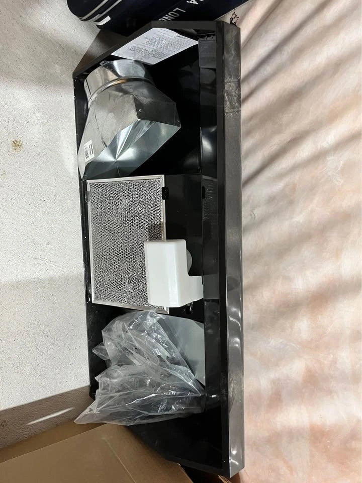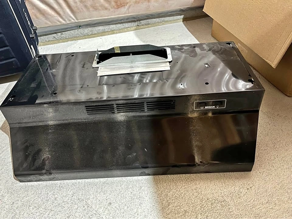 This is a new Broan range hood, 30 inches wide. It came with a new house but was replaced with a different one shortly after moving in. It's been stored in the basement and has a bit of dust on it, but it has never been used. Accessories shown in the photos are included. Pickup is available in Ajax or at Yonge & Eglinton.