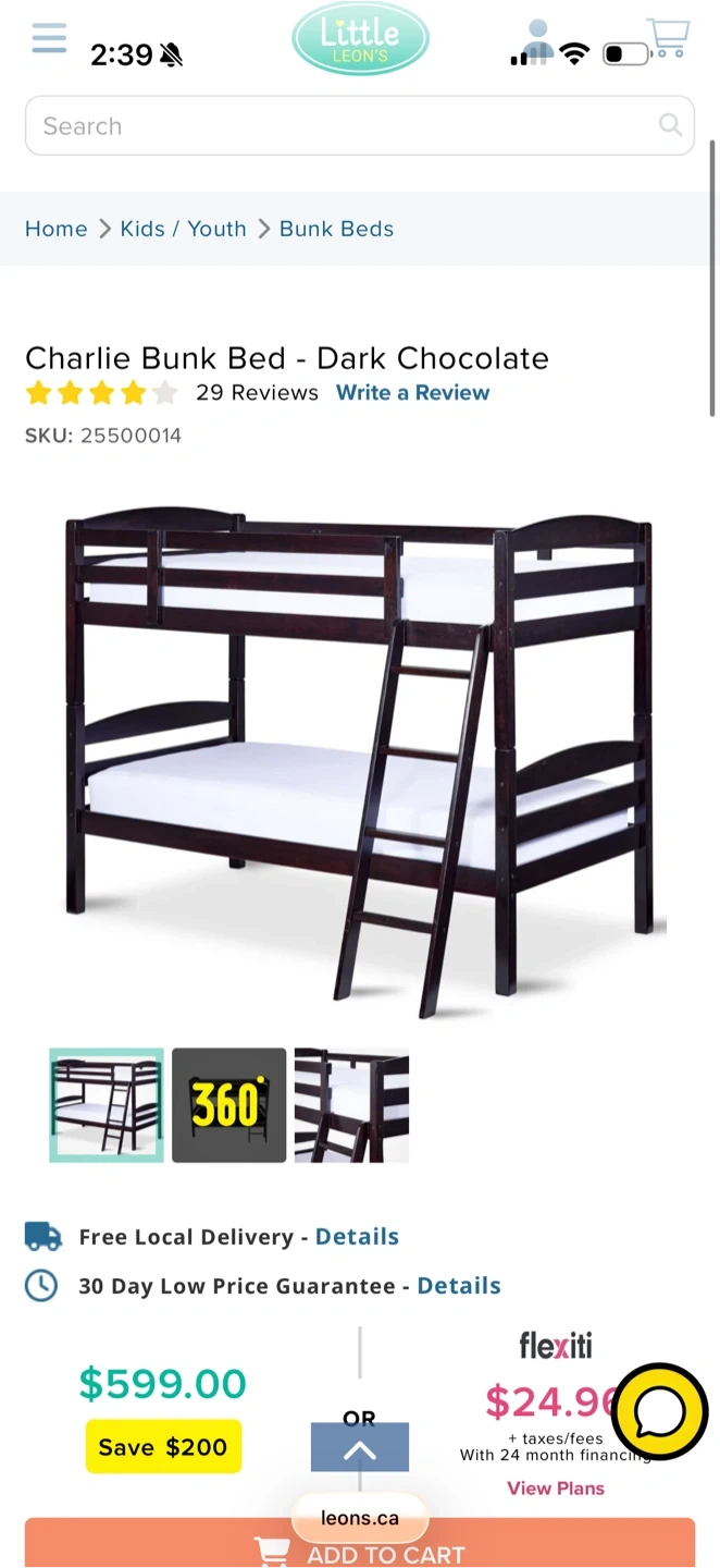 This twin bunk bed is a dark chocolate colour. It's a solid wood construction with a ladder. It's great for kids' rooms!