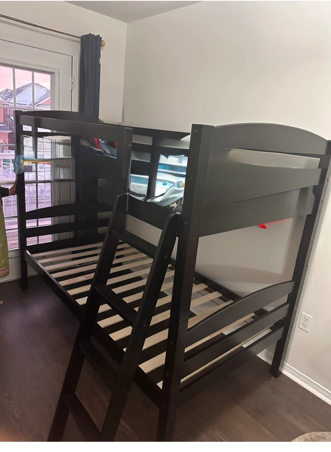 This twin bunk bed is a dark chocolate colour. It's a solid wood construction with a ladder. It's great for kids' rooms!