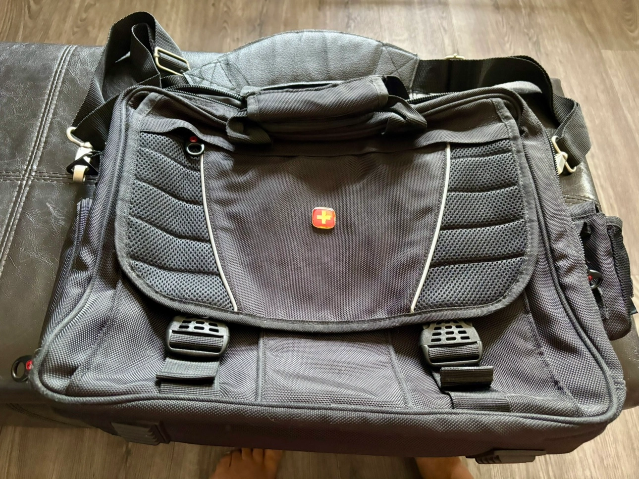 Durable black messenger bag. Multiple compartments and pockets. Adjustable shoulder strap. Great for work or travel. Personal item size.