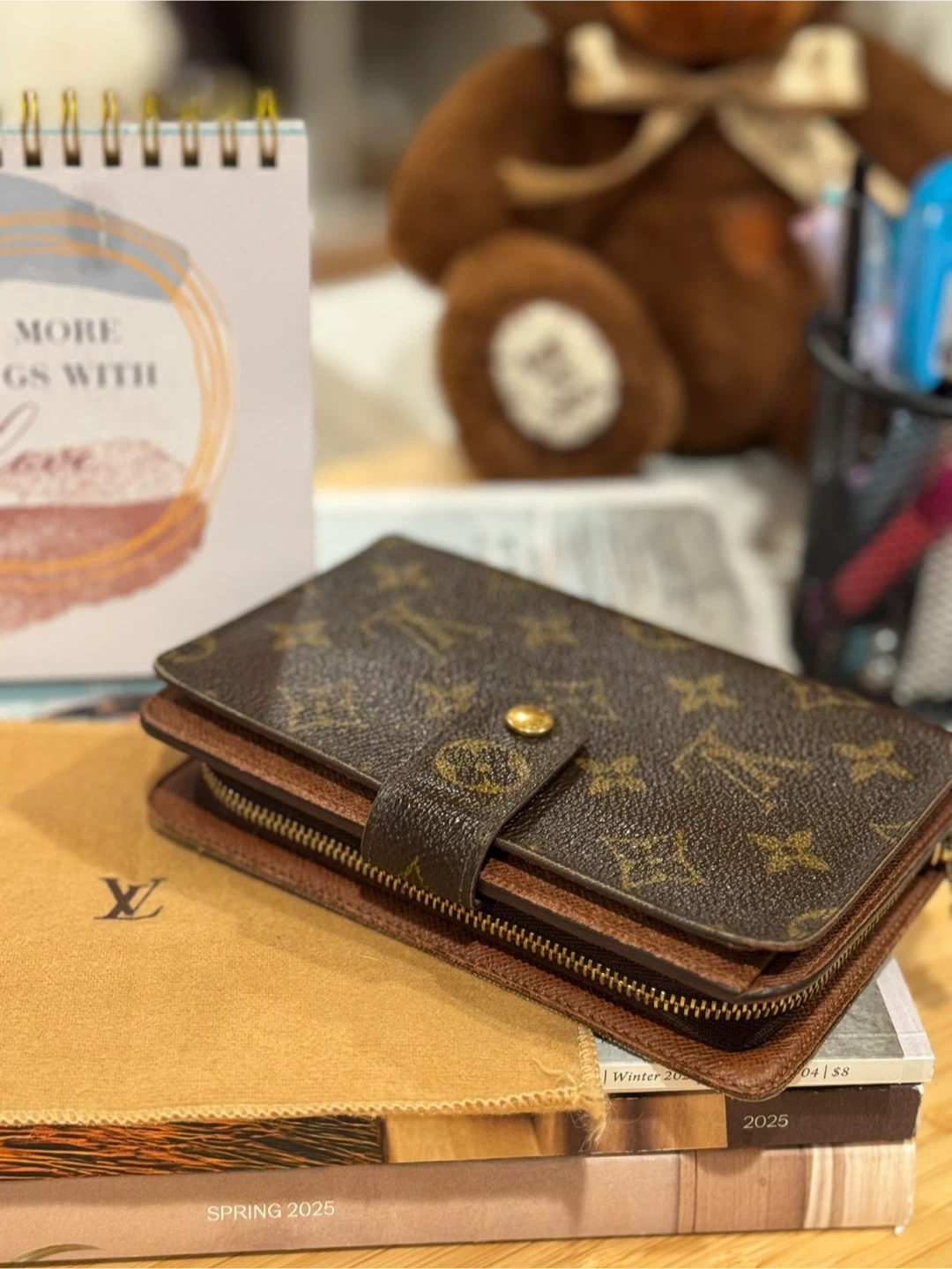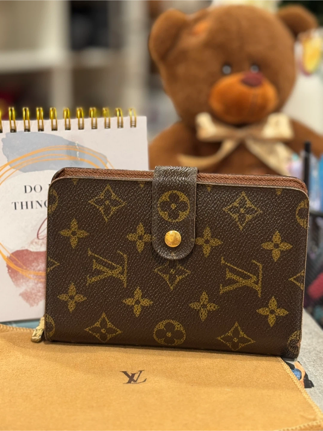 Classic Louis Vuitton monogram wallet. It's made from coated canvas with leather trim. Includes a snap closure and a zippered compartment. Perfect for keeping your essentials organized! Bigger size