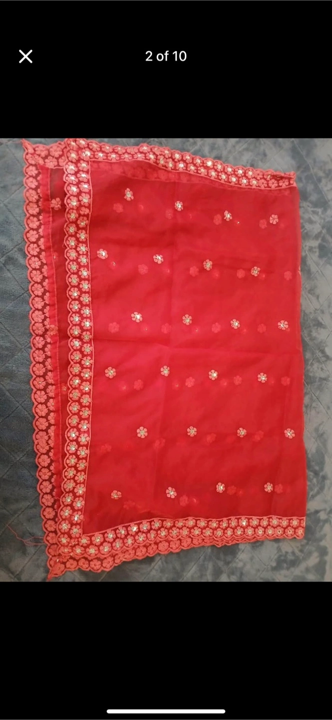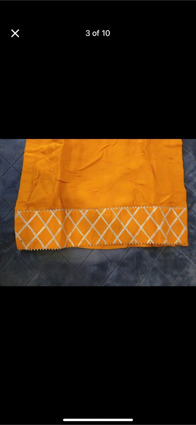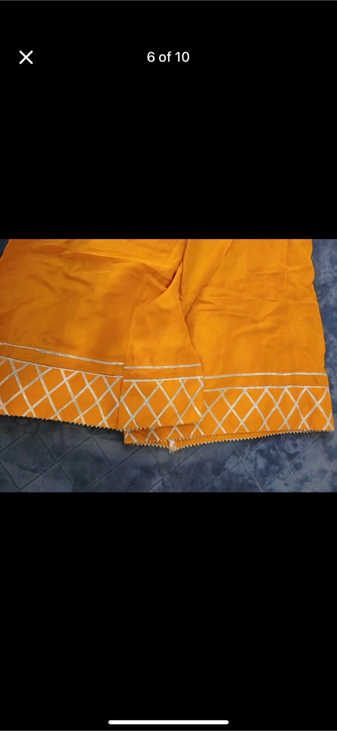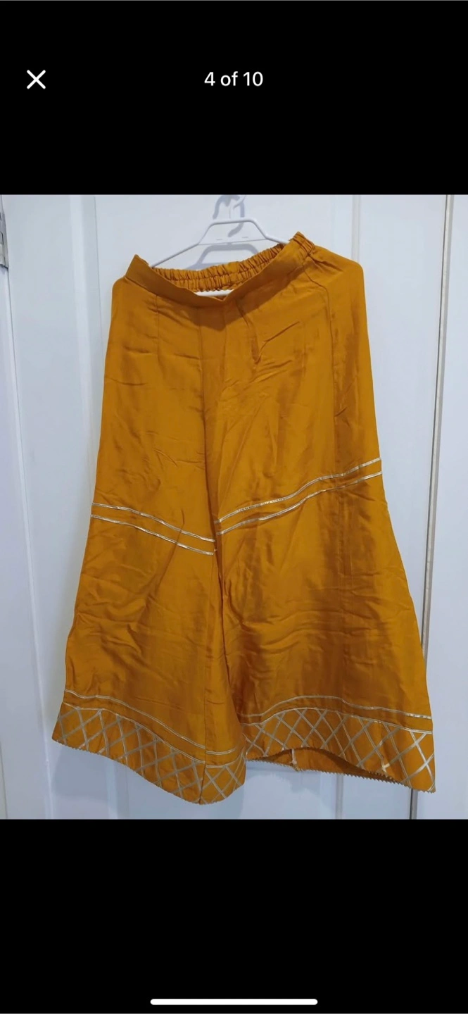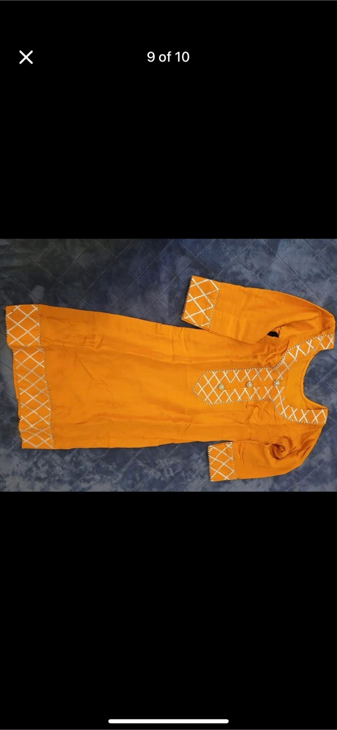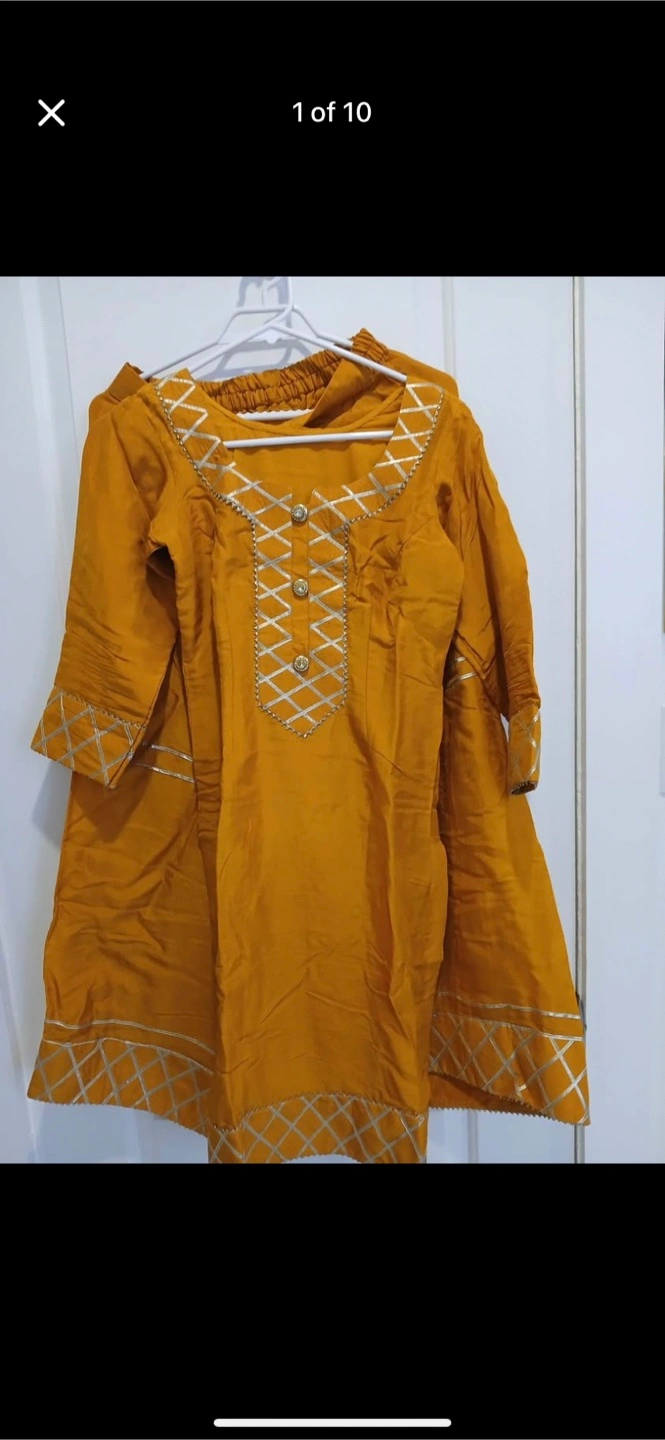 A beautiful salwar kameez suit, perfect for special occasions! The set includes a mustard-coloured kameez with silver detailing and a red dupatta. It's in great condition and ready for a new home
