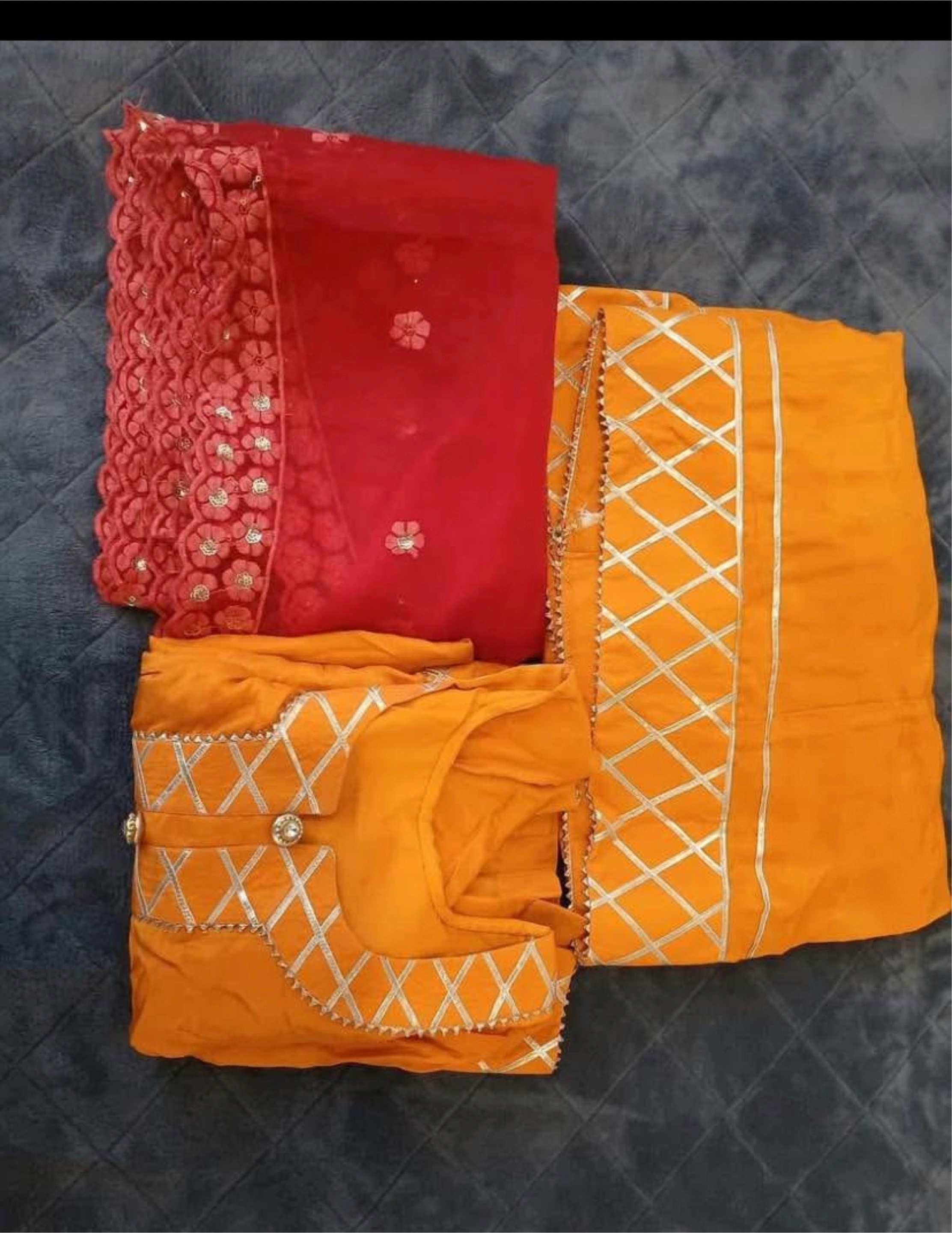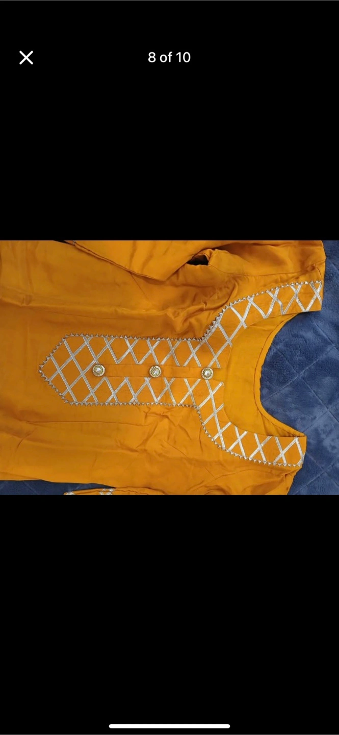 A beautiful salwar kameez suit, perfect for special occasions! The set includes a mustard-coloured kameez with silver detailing and a red dupatta. It's in great condition and ready for a new home