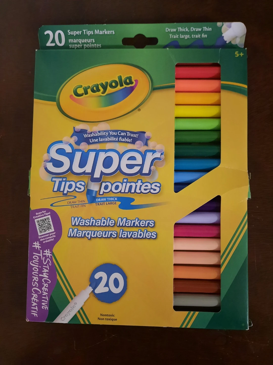 This is a pack of Crayola Super Tips Washable Markers with 20 colours. They're nontoxic and offer washability you can trust. This set allows for drawing thick or thin lines.