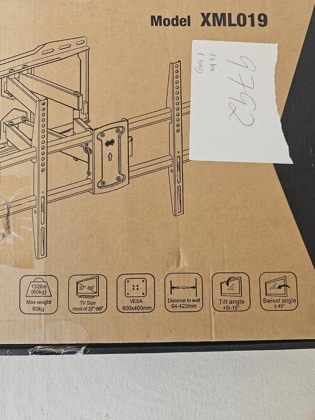 This is a USX-MOUNT Full-Motion TV Wall Mount, model XML019. It supports a maximum weight of 132lbs (60kg). The VESA compatibility is 600x400mm and it extends 64-422mm from the wall. It offers tilt angles of +/-15 degrees and swivel angles of +/-45 degrees. 37'-86' size