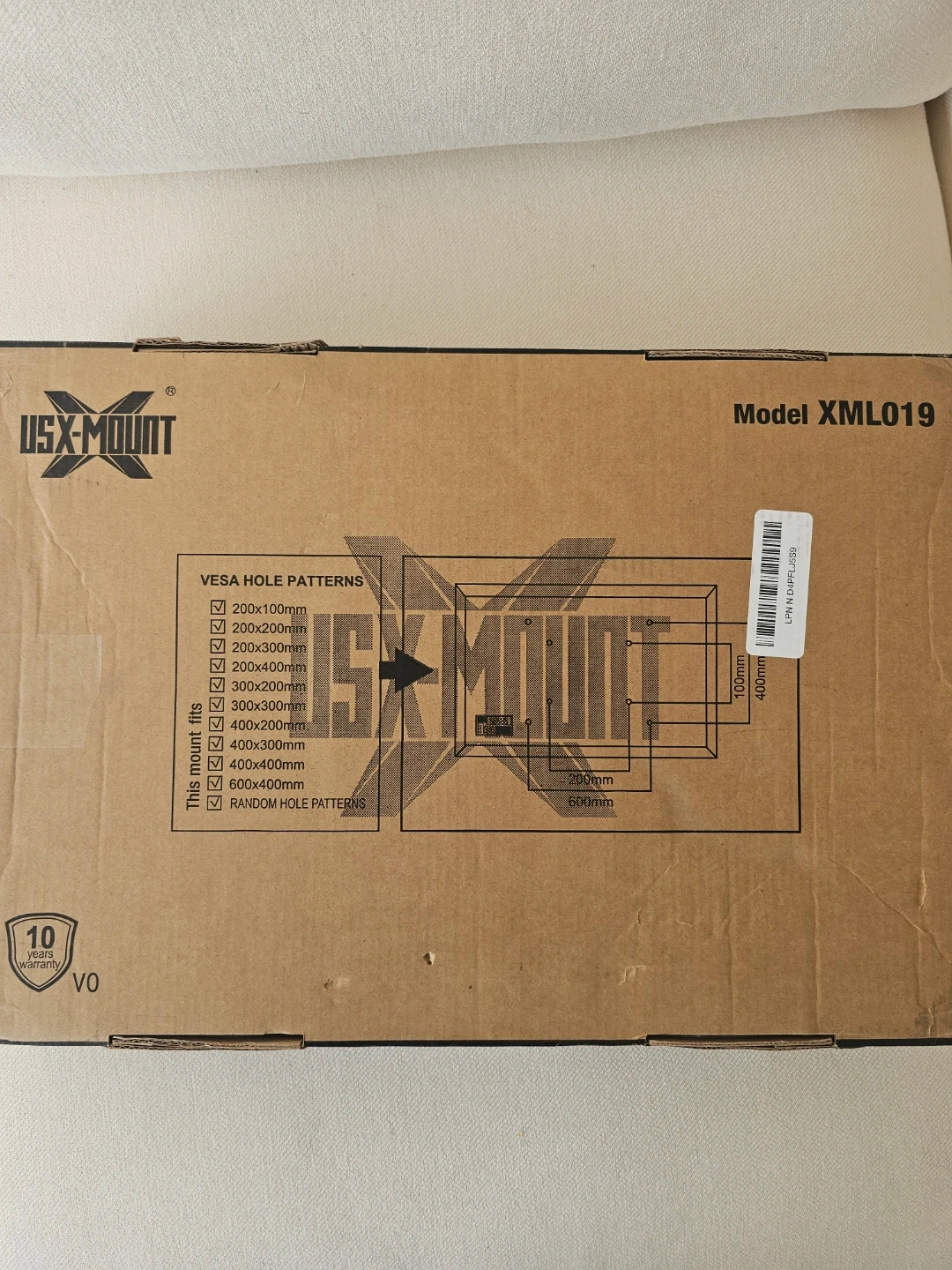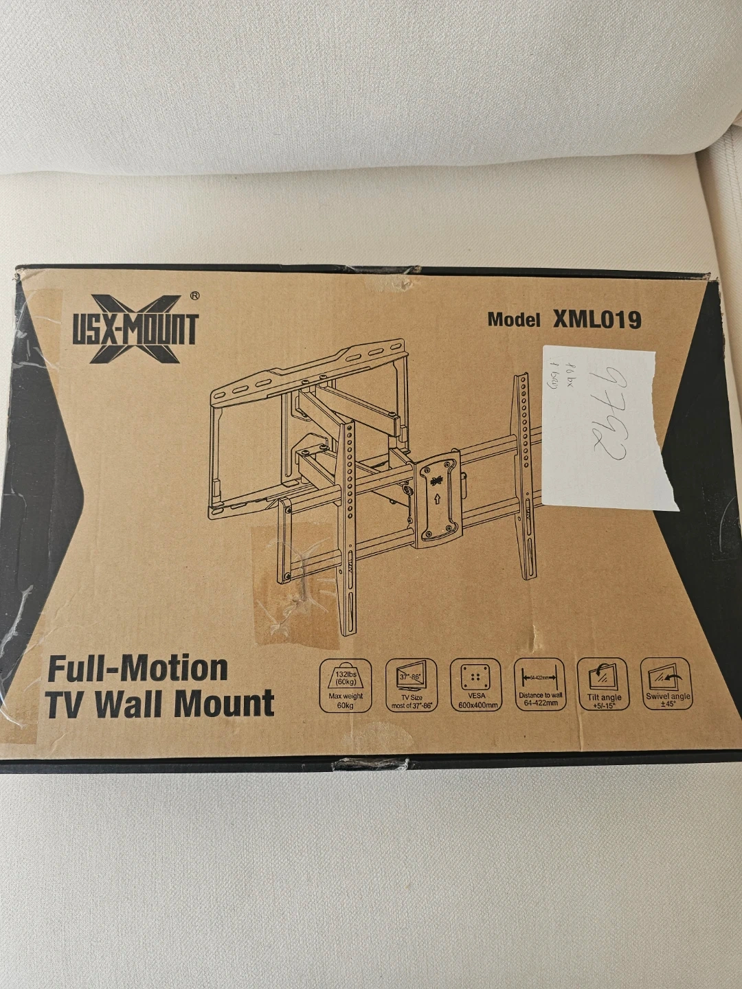 This is a USX-MOUNT Full-Motion TV Wall Mount, model XML019. It supports a maximum weight of 132lbs (60kg). The VESA compatibility is 600x400mm and it extends 64-422mm from the wall. It offers tilt angles of +/-15 degrees and swivel angles of +/-45 degrees. 37'-86' size