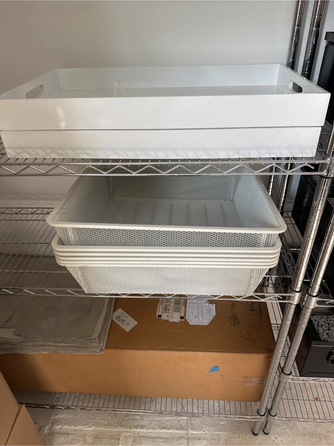 This white mesh tray is perfect for organizing its at home or office. It's made of metal mesh and has a simple, modern design. Great for desks or shelves! Total of 6.