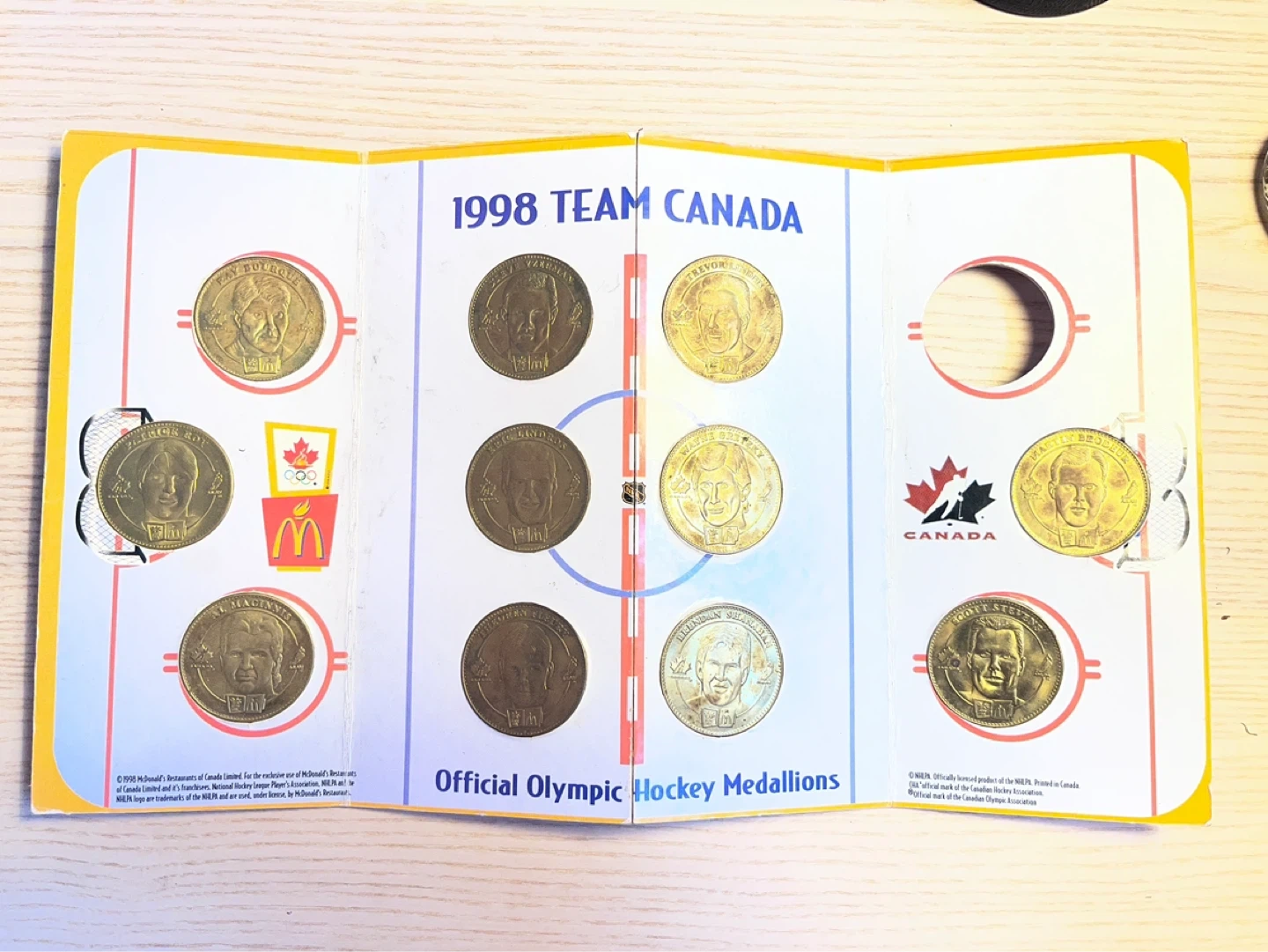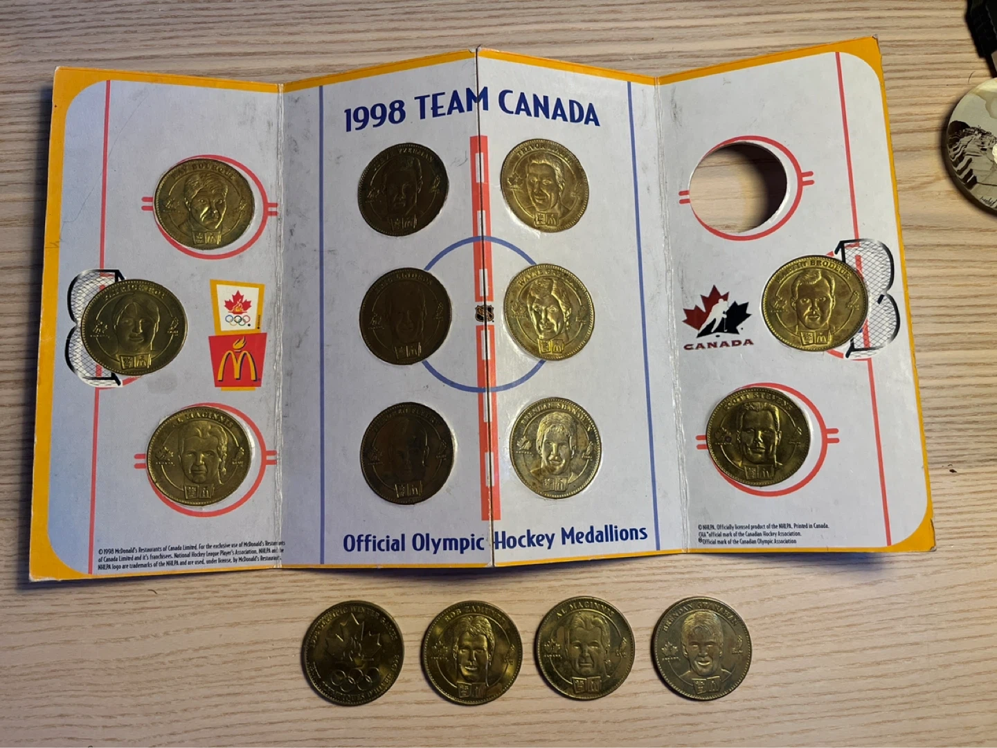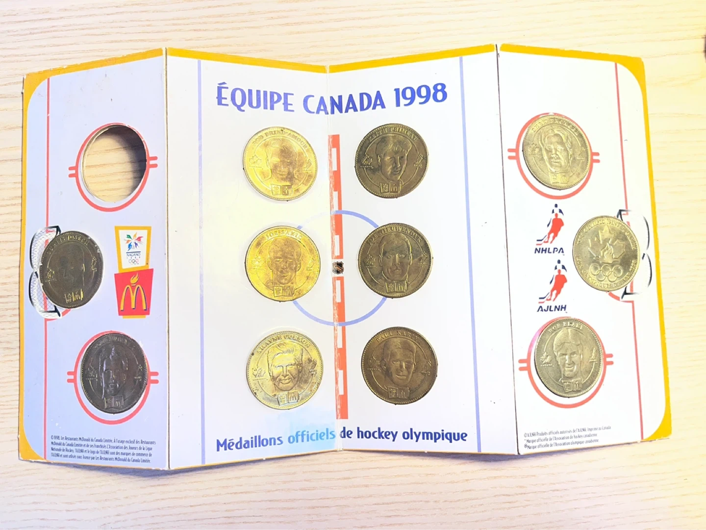 Collectable set of 1998 Team Canada Official Olympic Hockey Medallions, featuring notable Canadian hockey players. Includes the original display folder. These medallions were a promotion from McDonald's Canada.