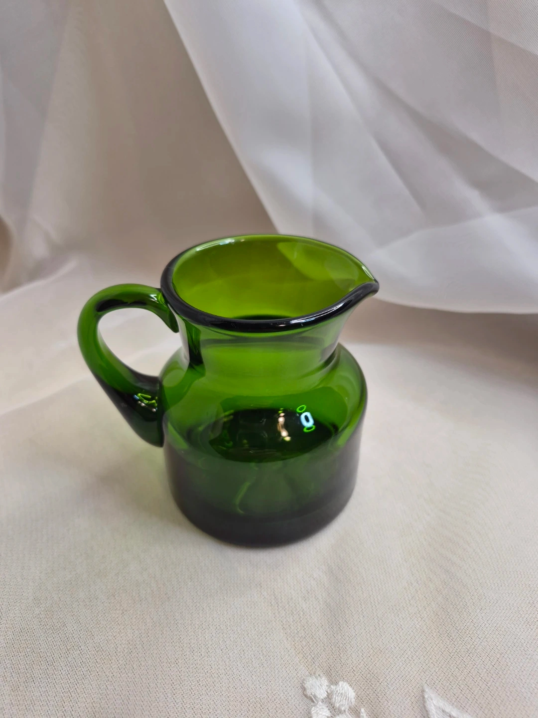 Beautiful Vintage Hand Blown Emerald Green Glass 3 1/2" Jug....