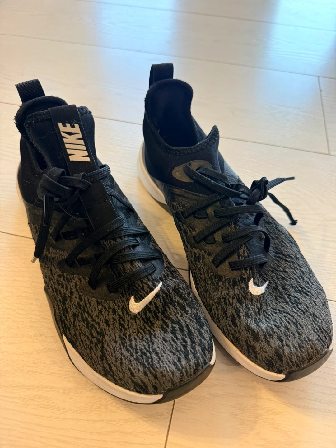 These Nike athletic shoes are black and grey. They're a women's US size 7.5. These would be great for training or running!