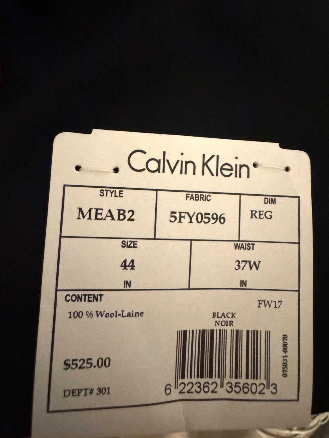 sell this brand new Calvin Klein suit. It's a stylish black colour and made of 100% wool. The jacket is a size 44 and the waist is 38”. Originally bought for $525!