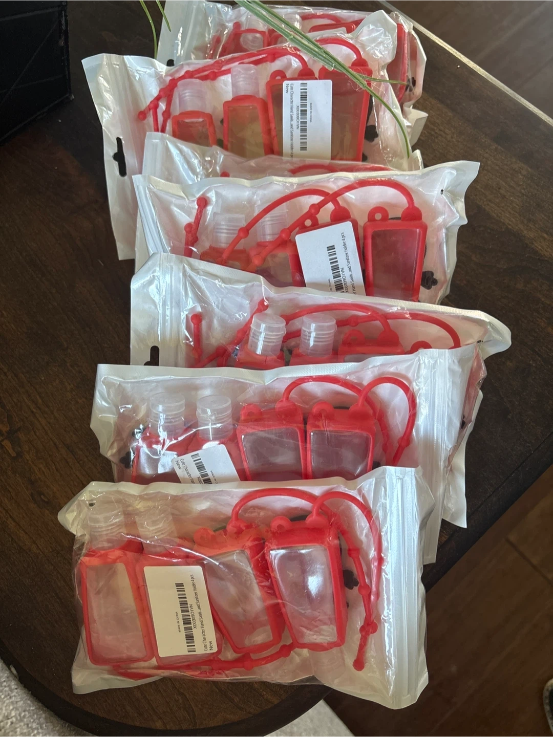 7 bag Set of 4 cute character hand sanitizer holders. Red coloured, each comes with a lanyard. Perfect for on-the-go use! $5 each