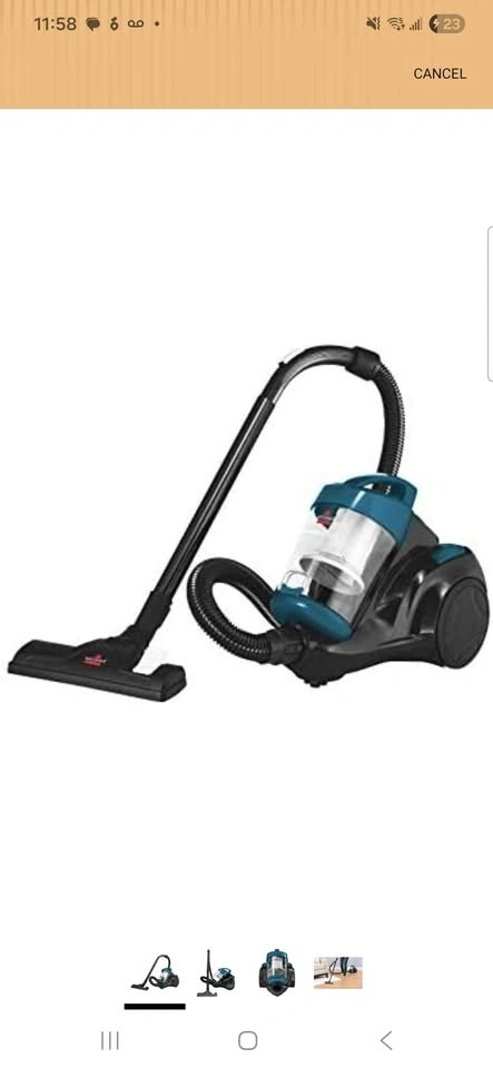 Compact Bissell PowerForce canister vacuum in black and blue. It's bagless and easy to empty, great for quick cleanups. Comes with a retractable extension cord (approx. 15 feet), hose, wand, and floor head. Pick up location is between Sheppard and Jane Street.