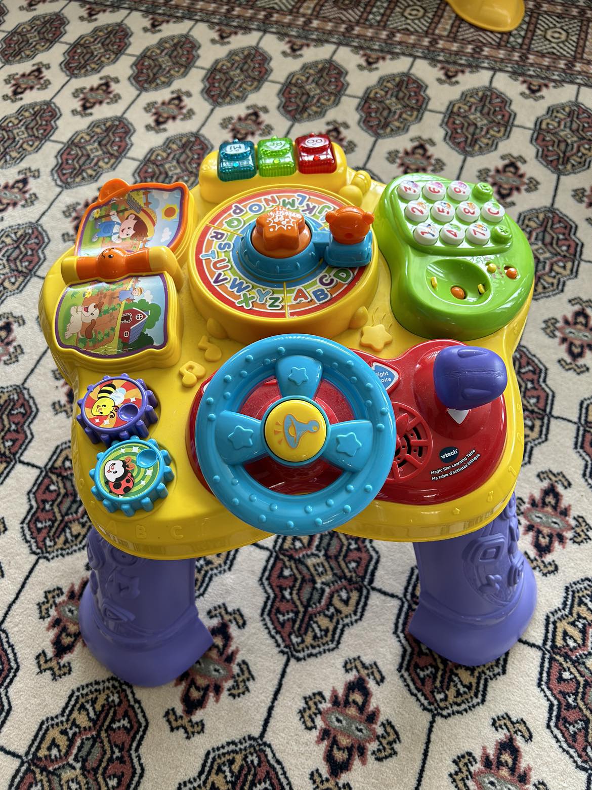 In very good condition. Suitable for ages 6-36 months. It’s bilingual, English or French. The learning table has 2 ways to play: 1- floor play (by removing the legs) and 2- table play. Will need new batteries. Everything is in good working order, but the only thing the little phone is missing, wasn’t able to find it. However it doesn’t affect the whole enjoyment of playing.
