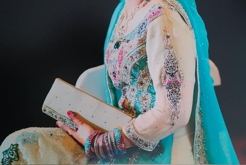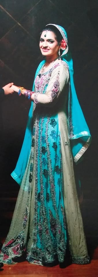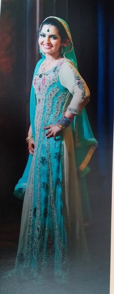 Gorgeous wedding walima Maxi dress in beautiful pastel blues and greens. The dress is filled with intricate details. Size small.
