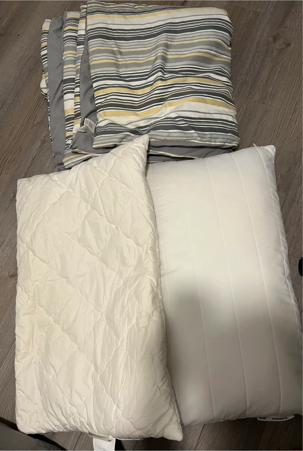 This IKEA RUMSMALVA pillow and duvet set features a striped duvet cover and two white pillows. One pillow is quilted, and the other has a smooth finish. It's a great set for any bedroom!