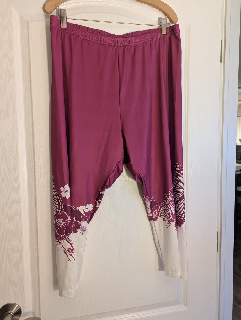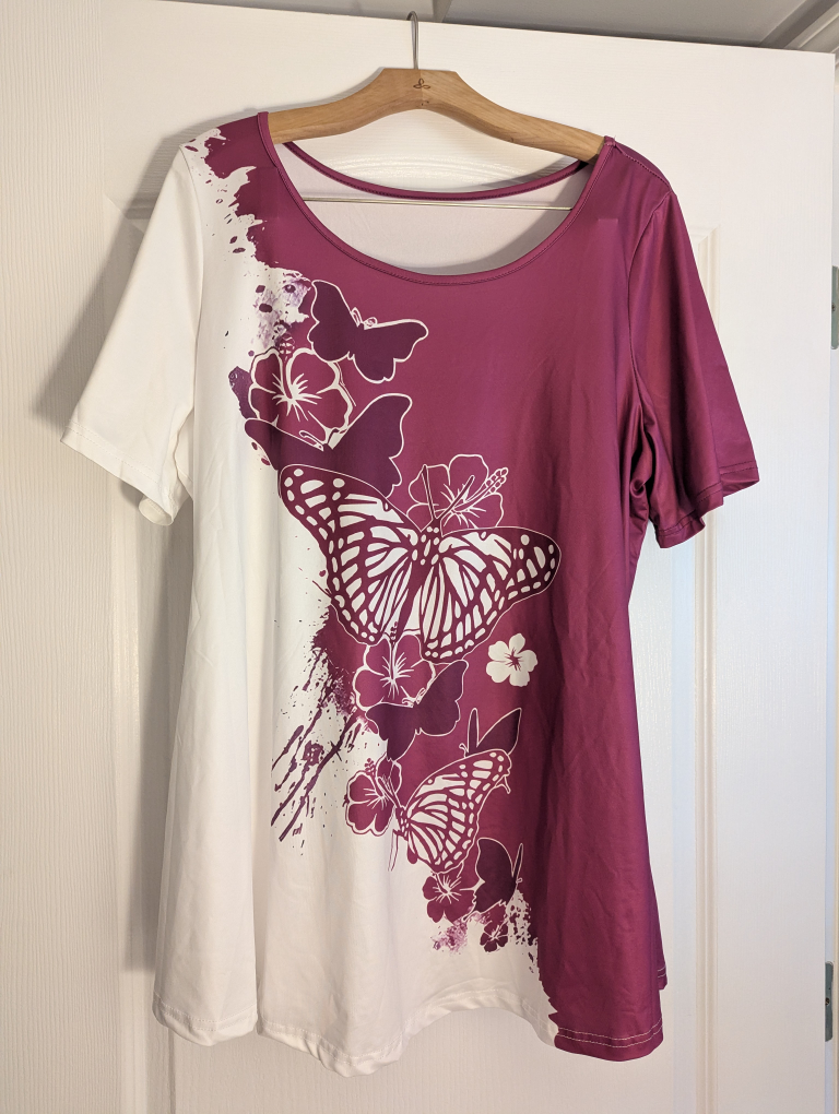Cute matching top and capris set with a butterfly and floral print! The top is white on one side and magenta on the other, with a butterfly and flower design. The pants are magenta with a similar butterfly and flower design near the ankles. Perfect for lounging around the house or a casual outing