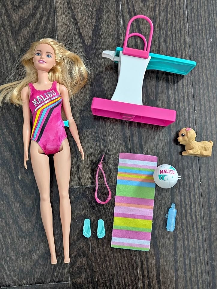 Barbie Malibu swim doll set. Includes a Barbie doll in a pink swimsuit, a diving board, a cute little dog, striped towel, a volleyball, tiny flip-flops, and a water bottle. Lots of accessories for pool play. Pickup in Nobleton.