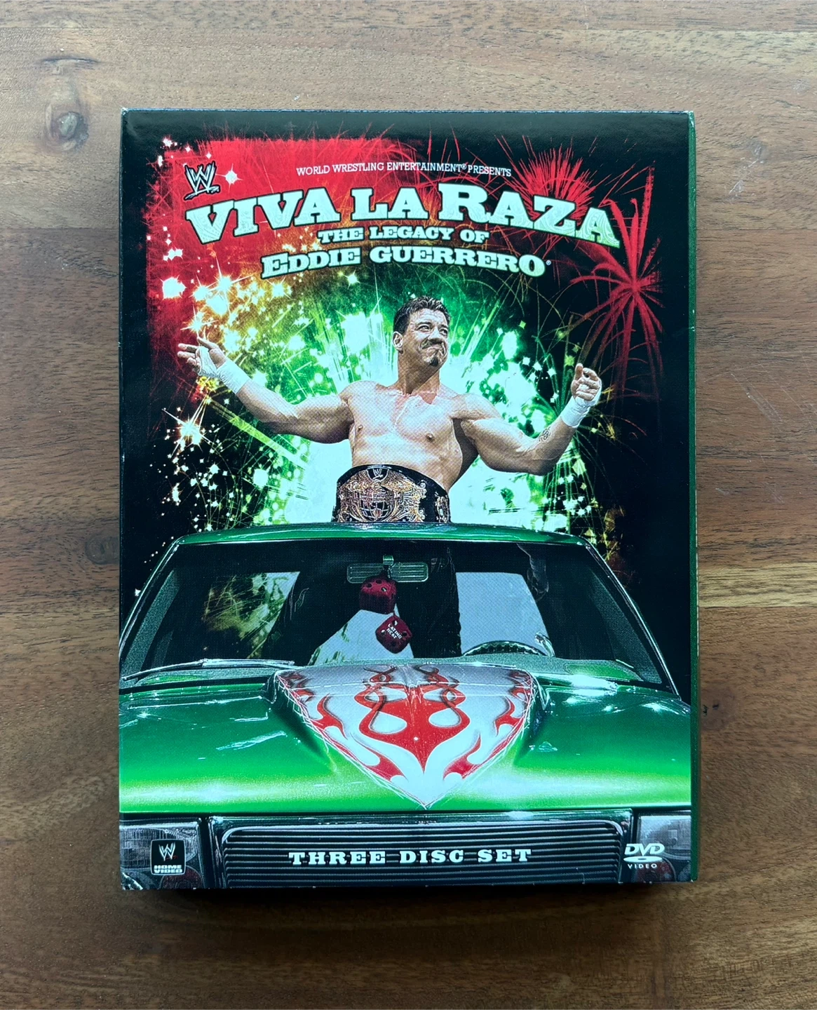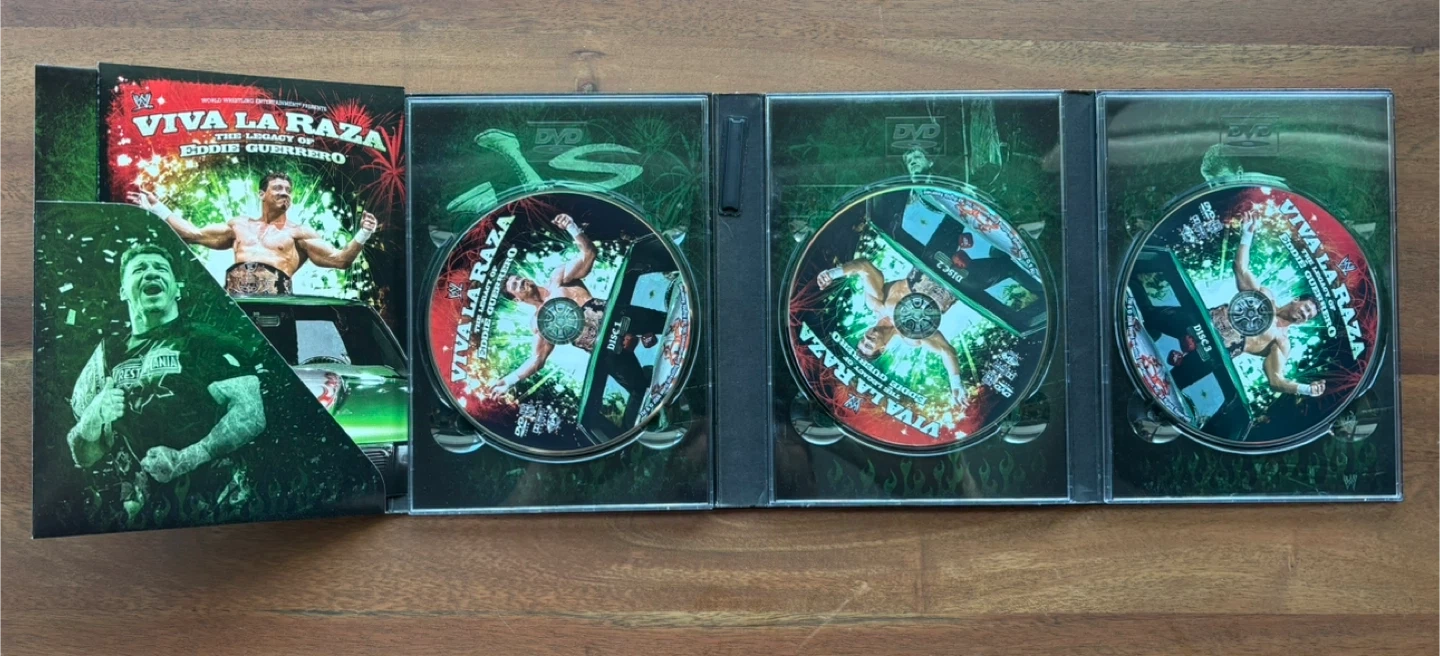 Selling a three-disc DVD set, Viva La Raza: The Legacy of Eddie Guerrero. It's a great collection for any wrestling fan! The set comes in its original packaging