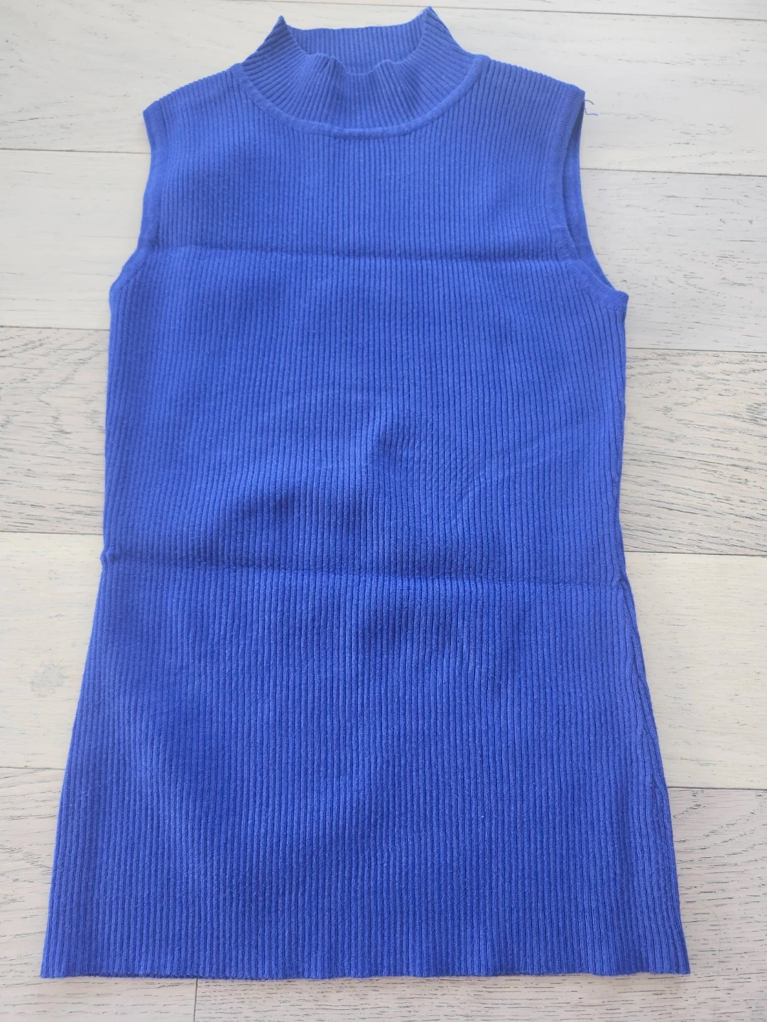 This is a blue sleeveless top with a ribbed texture. It has a mock neck and a slim fit. The material is stretchy and comfortable.