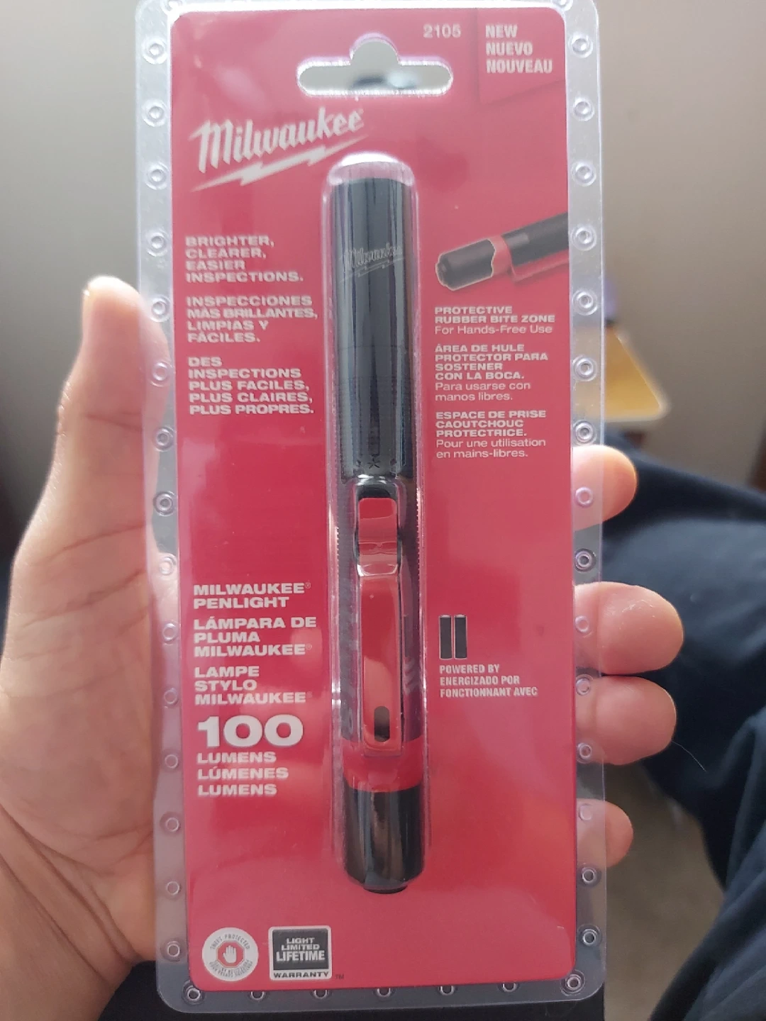 Milwaukee penlight with 100 lumens output. Includes 2 AAA batteries. It's waterproof and dustproof for tough jobs. Designed for hands-free use.