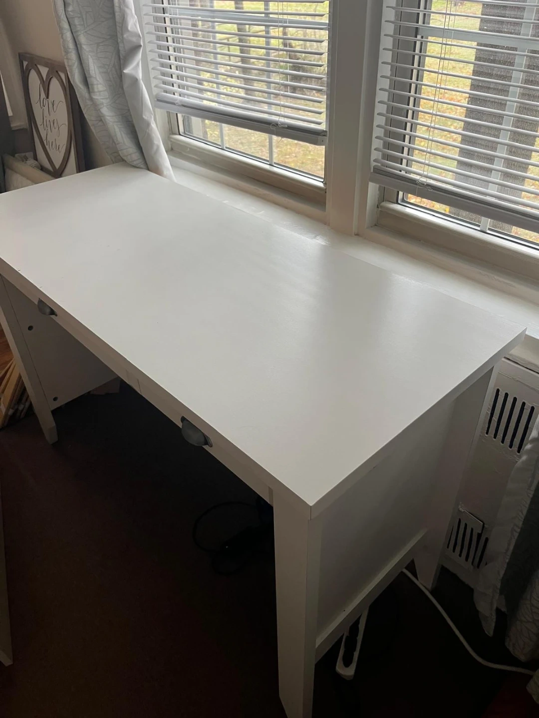 Selling a simple white desk with drawers. It's perfect for a home office or study space. It has a clean look and provides a good surface for working or studying